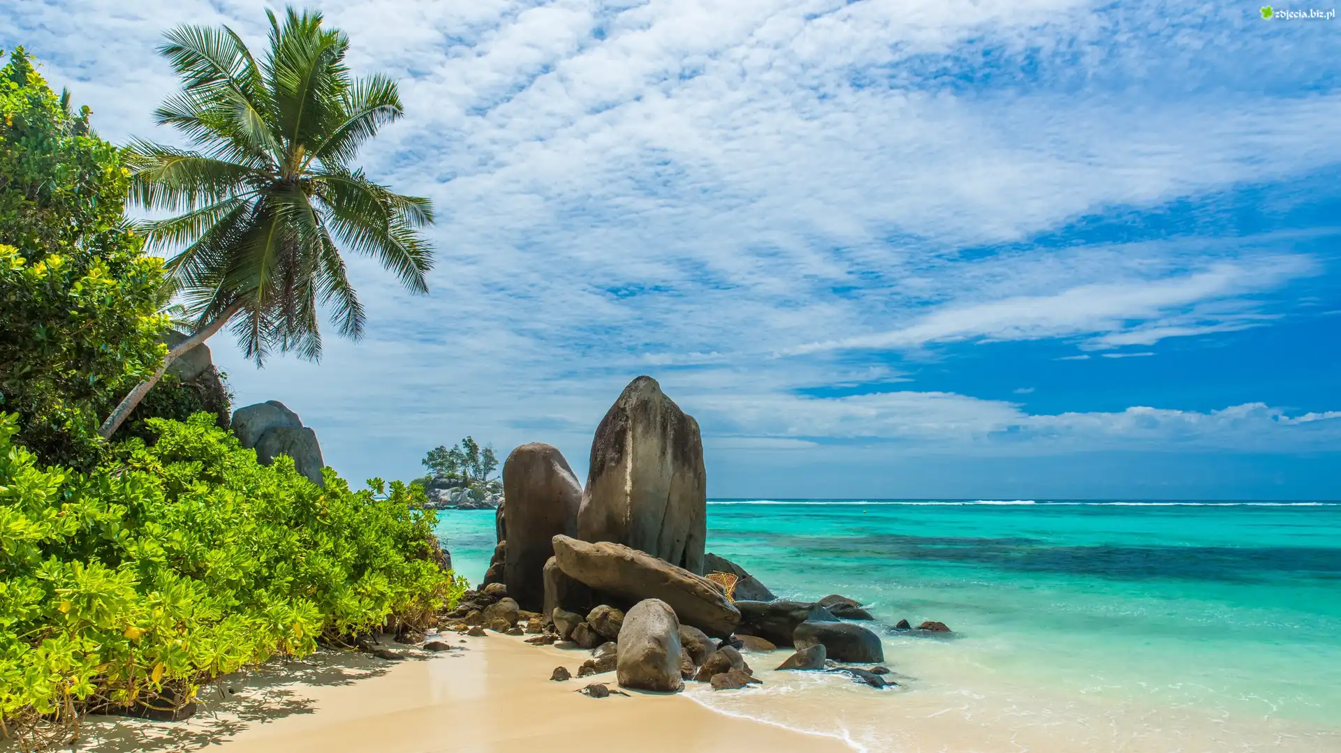 Zdjęcie, Morze, Plaża, Kamienie, Palmy, Roślinność, Chmury