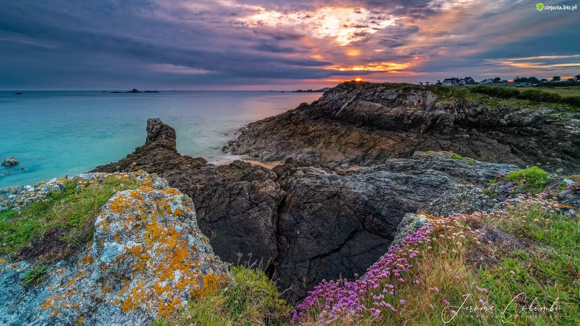 Zdjęcie Morze, Wybrzeże, Skały, Roślinność, Zachód słońca, Przylądek, Pointe de la Varde, Bretania, Francja |