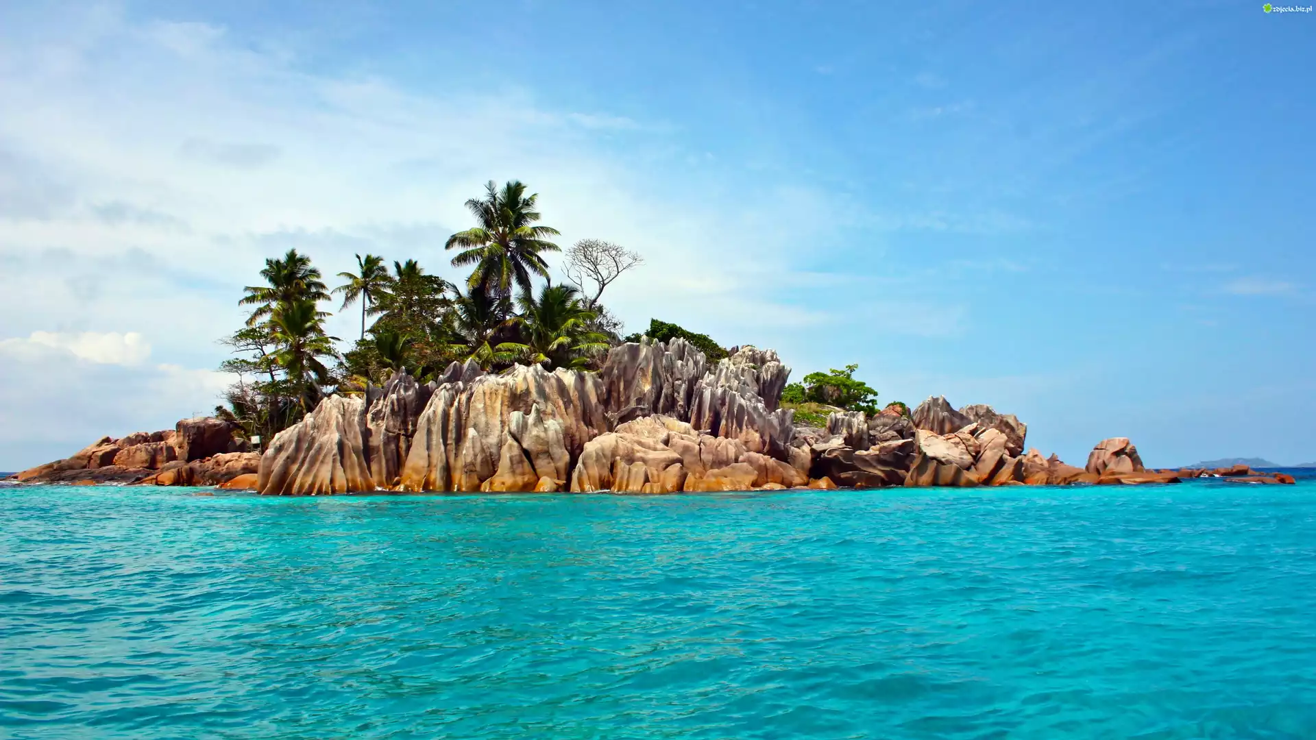 Zdjęcie Morze, Fale, Wyspa, Skały, Palmy