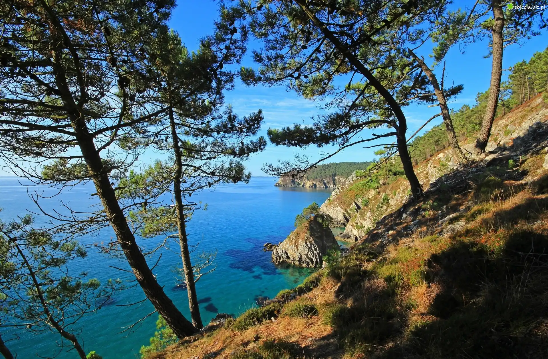 Zdjęcie, Morze, Wzgórza, Skały, Drzewa