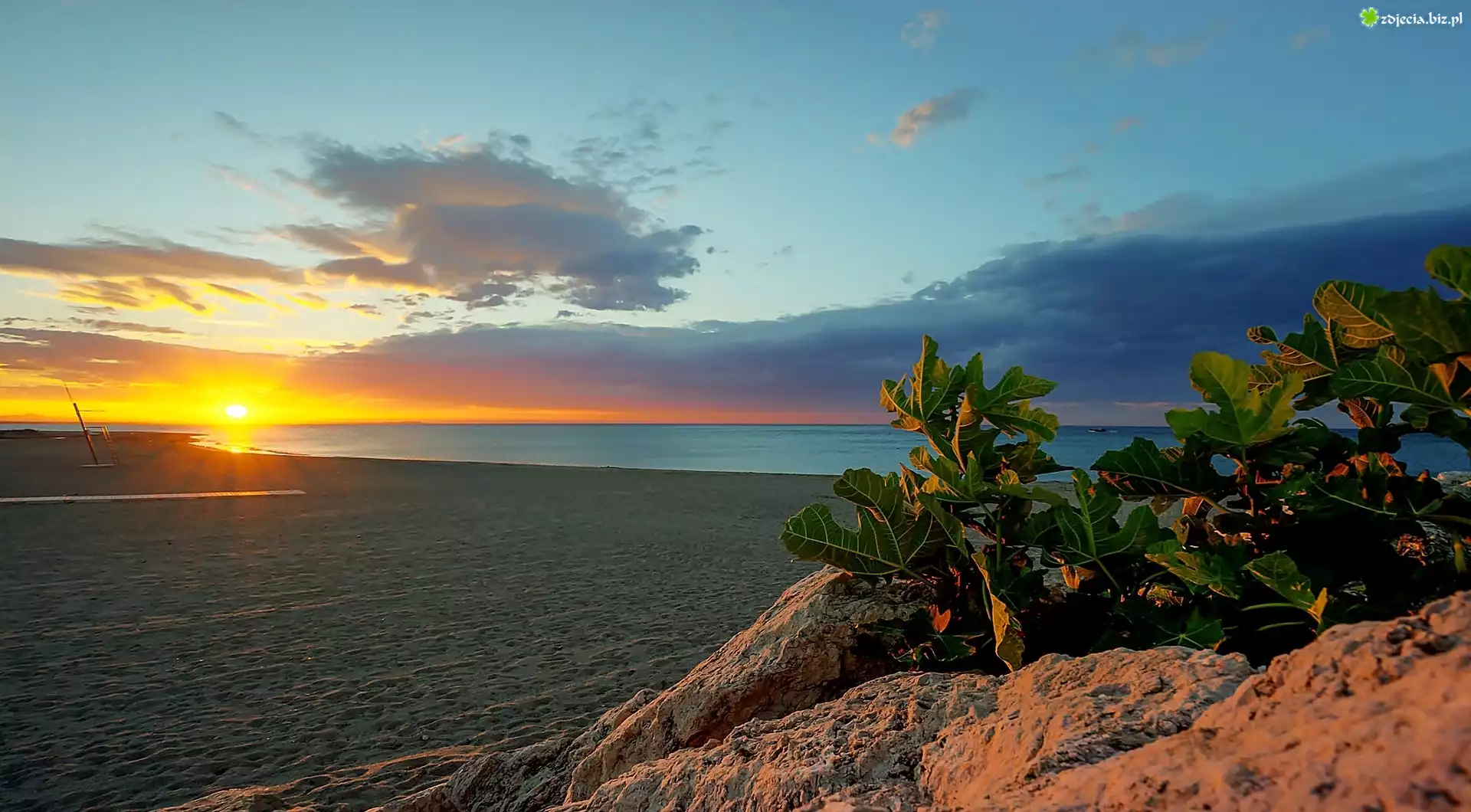 Zdjęcie Morze, Plaża, Niebo, Zachód, Słońca, Rośliny