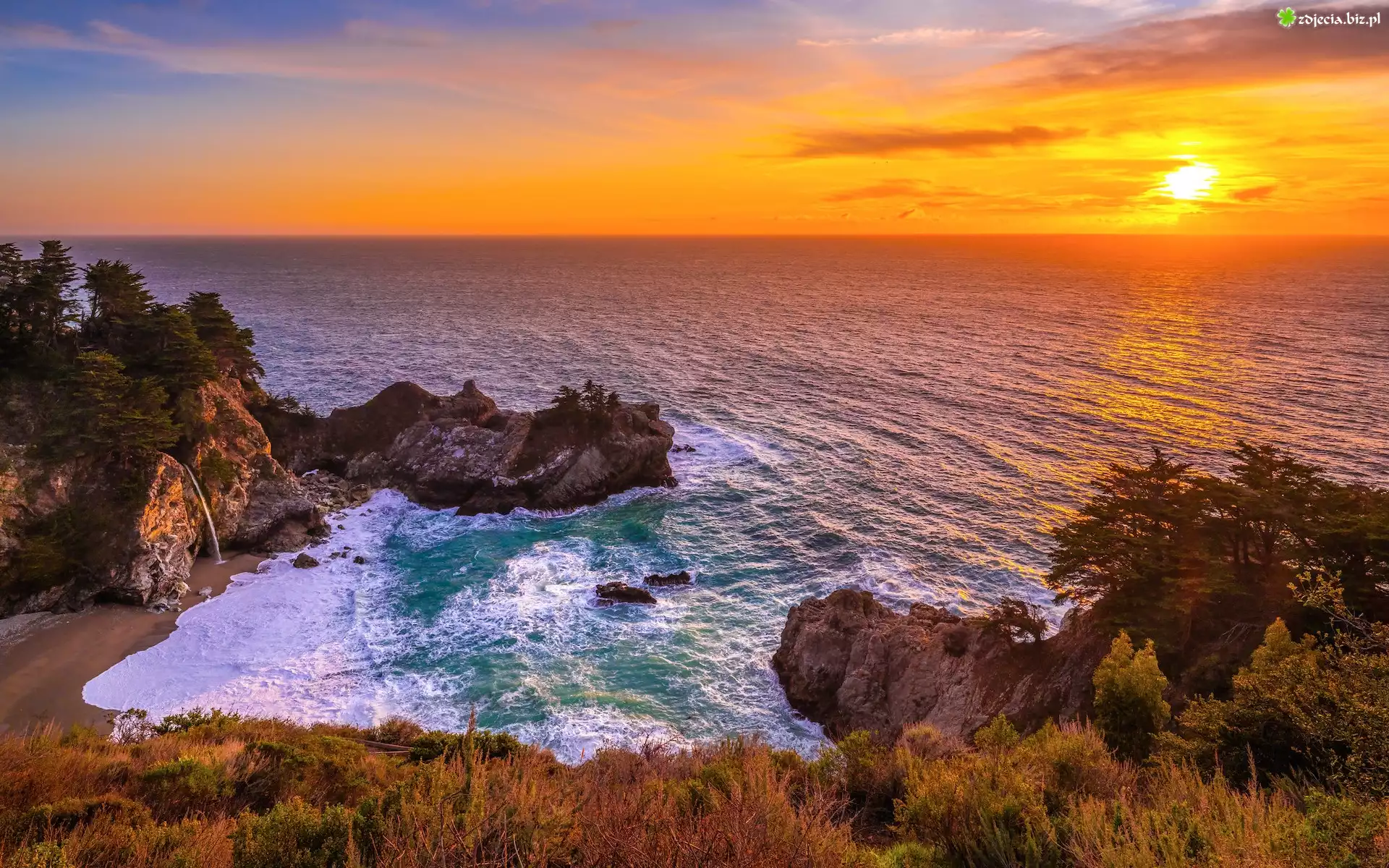 Zdjęcie Morze, Wybrzeże Big Sur, Skały, Zachód słońca, Plaża, Zatoka McWay Cove, Park Stanowy Julia Pfeiffer Burns, Kalifornia, Stany Zjednoczone |