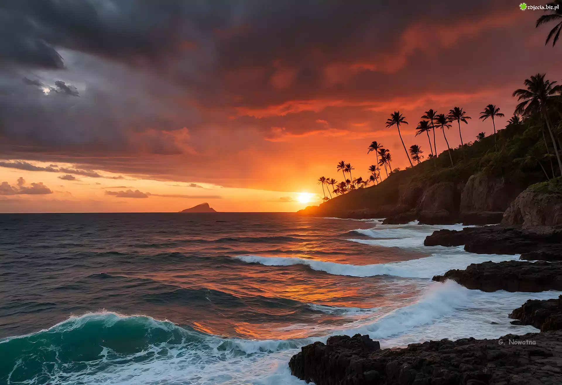 Zdjęcie Klif, Palmy, Wyspa, Morze, Zachód Słońca