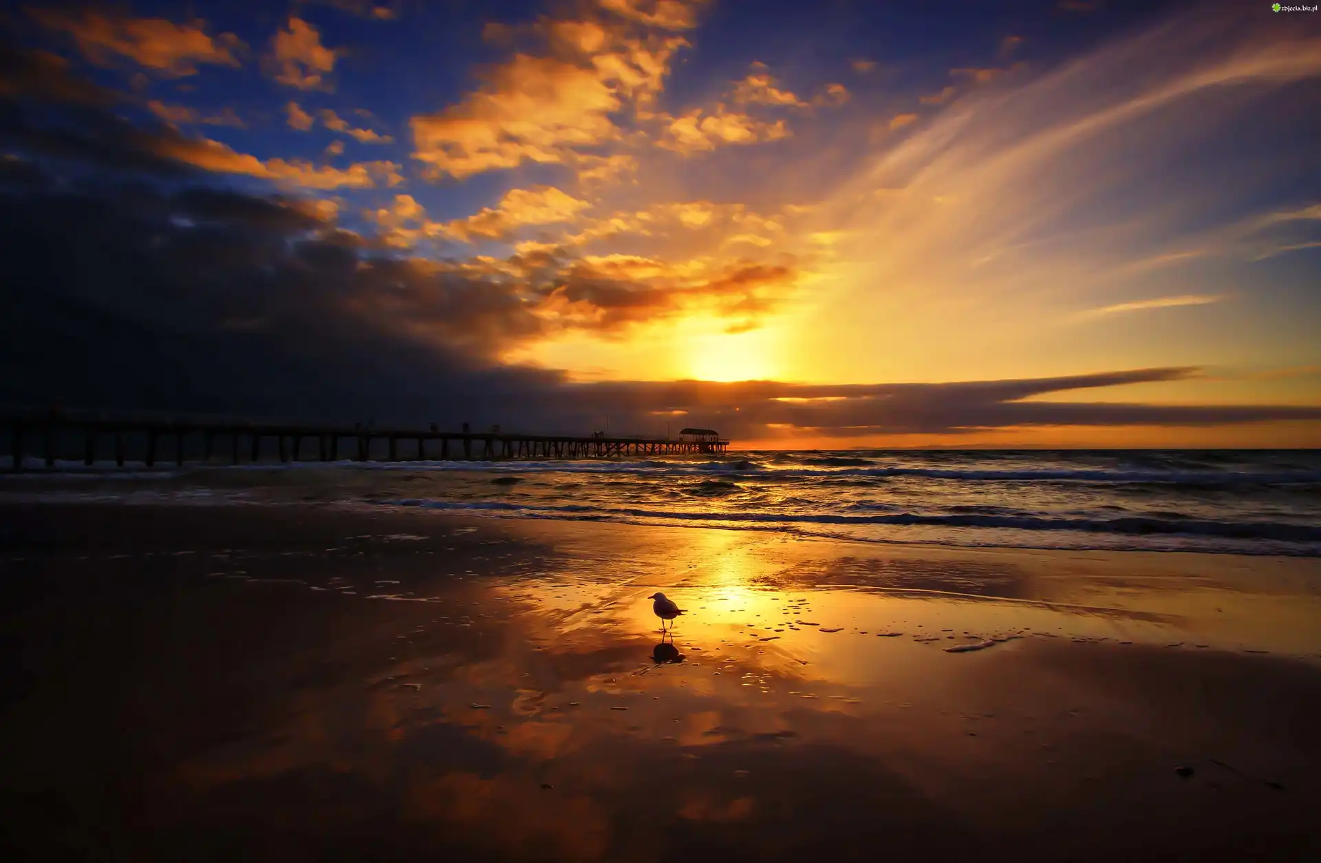 Zdjęcie Morze, Chmury, Zachód słońca, Ptak