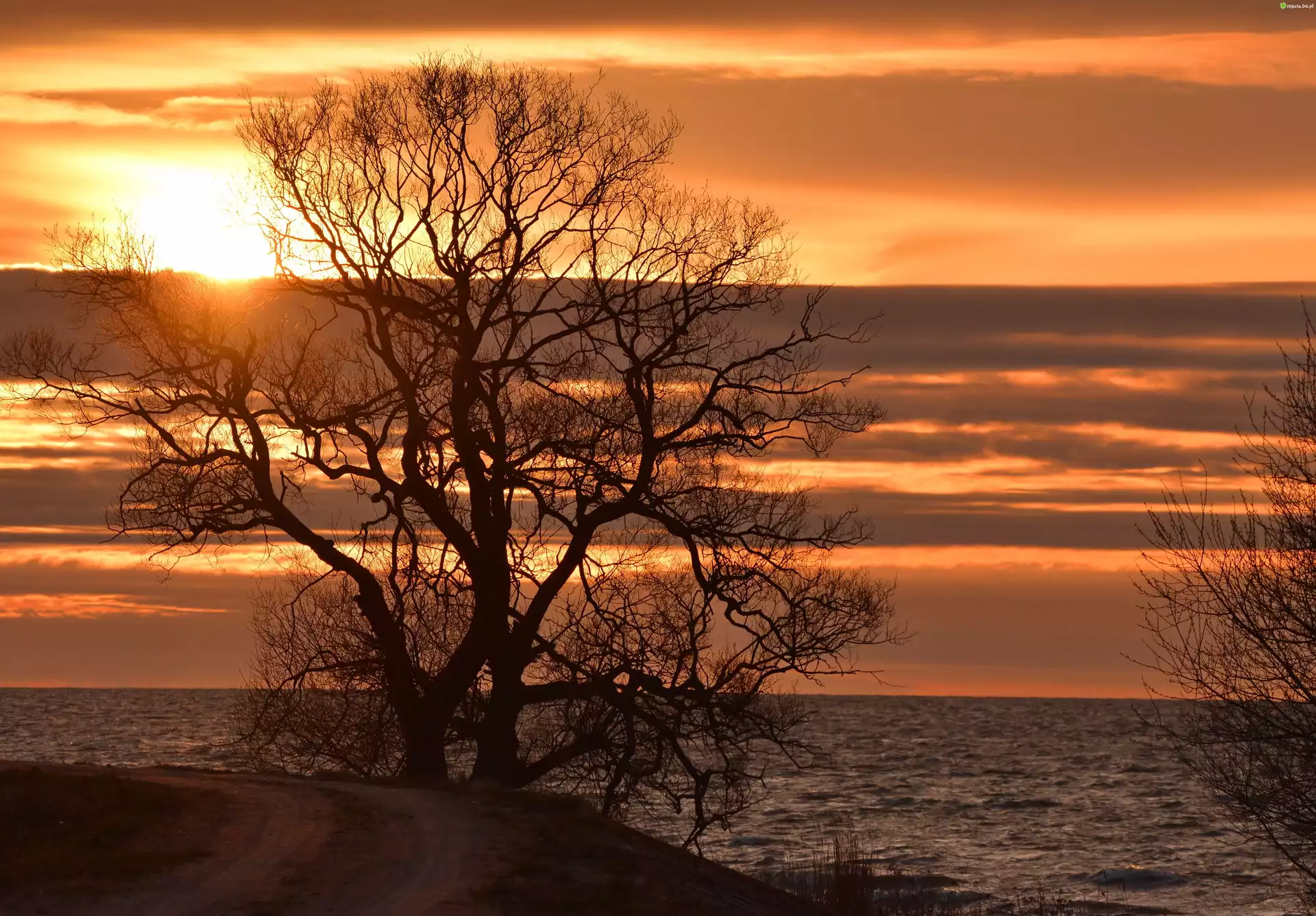 Zdjęcie, Morze, Zachód słońca, Drzewo