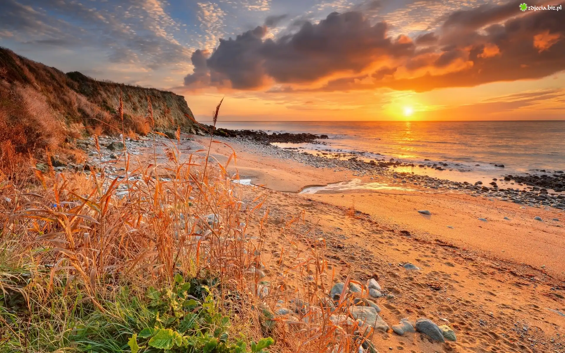 Zdjęcie Morze, Plaża, Zachód, Słońca, Trawa