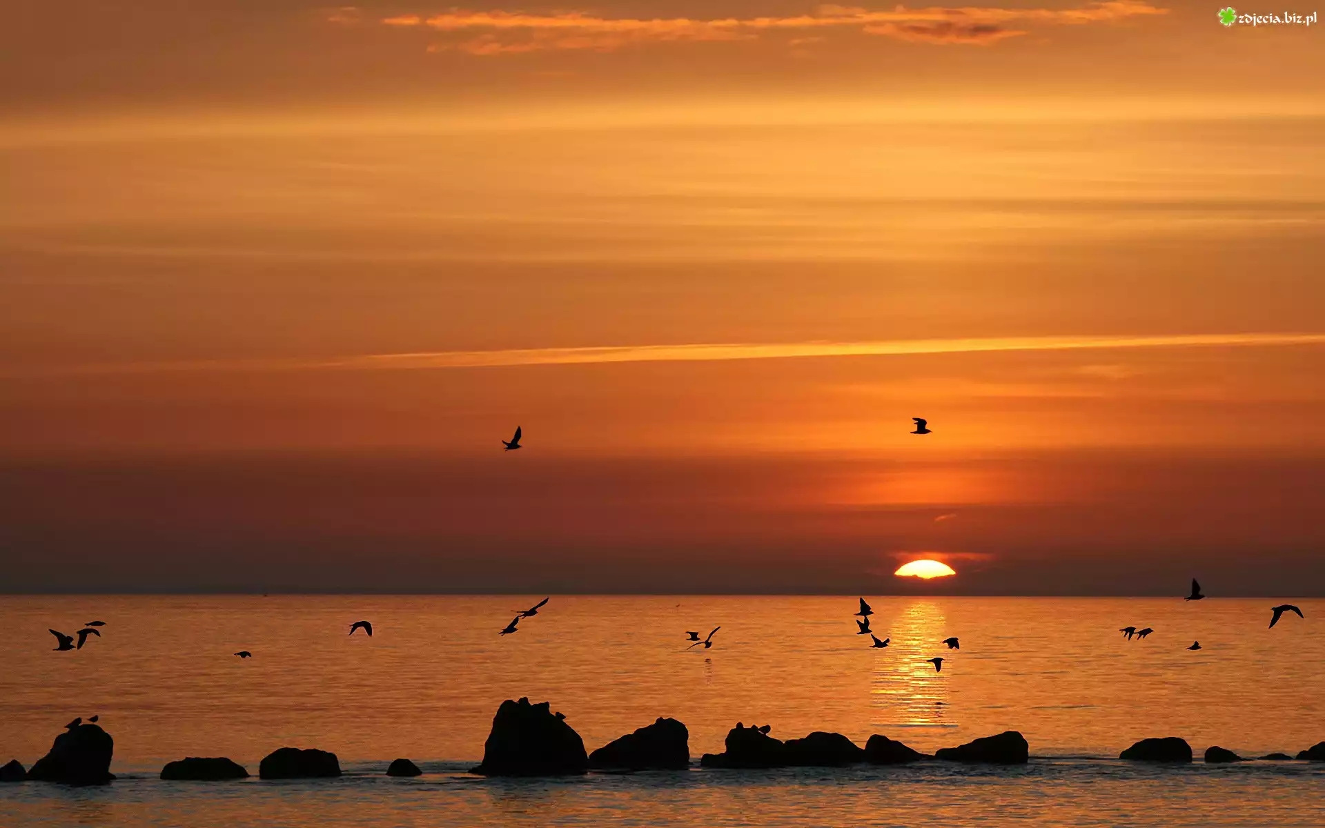 Zdjęcie Morze, Zachód, Słońca, Ptaki