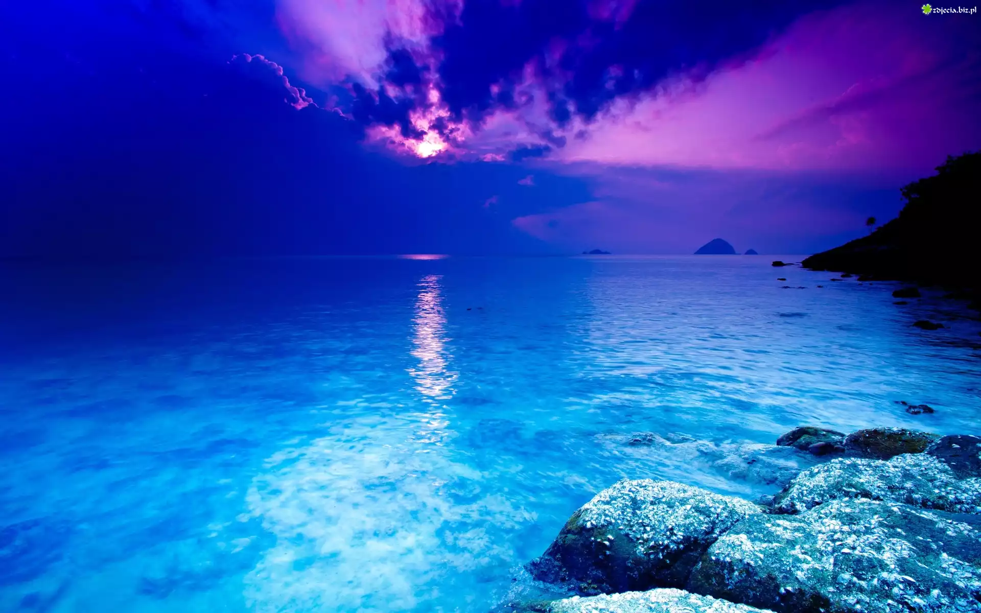 Zdjęcie Morze, Chmury, Zachodzące, Słońce, Skały