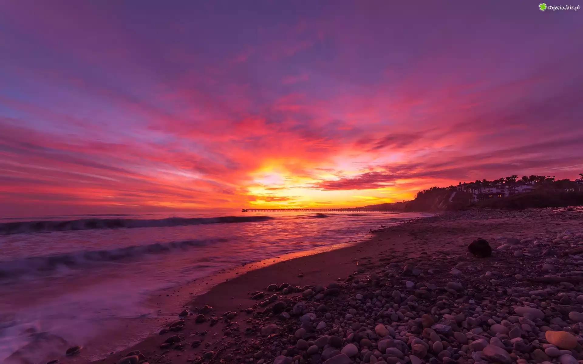 Zdjęcie Morze, Plaża, El Capitan State Beach, Kamienie, Molo, Zachód słońca, Santa Barbara, Stan Kalifornia, Stany Zjednoczone |