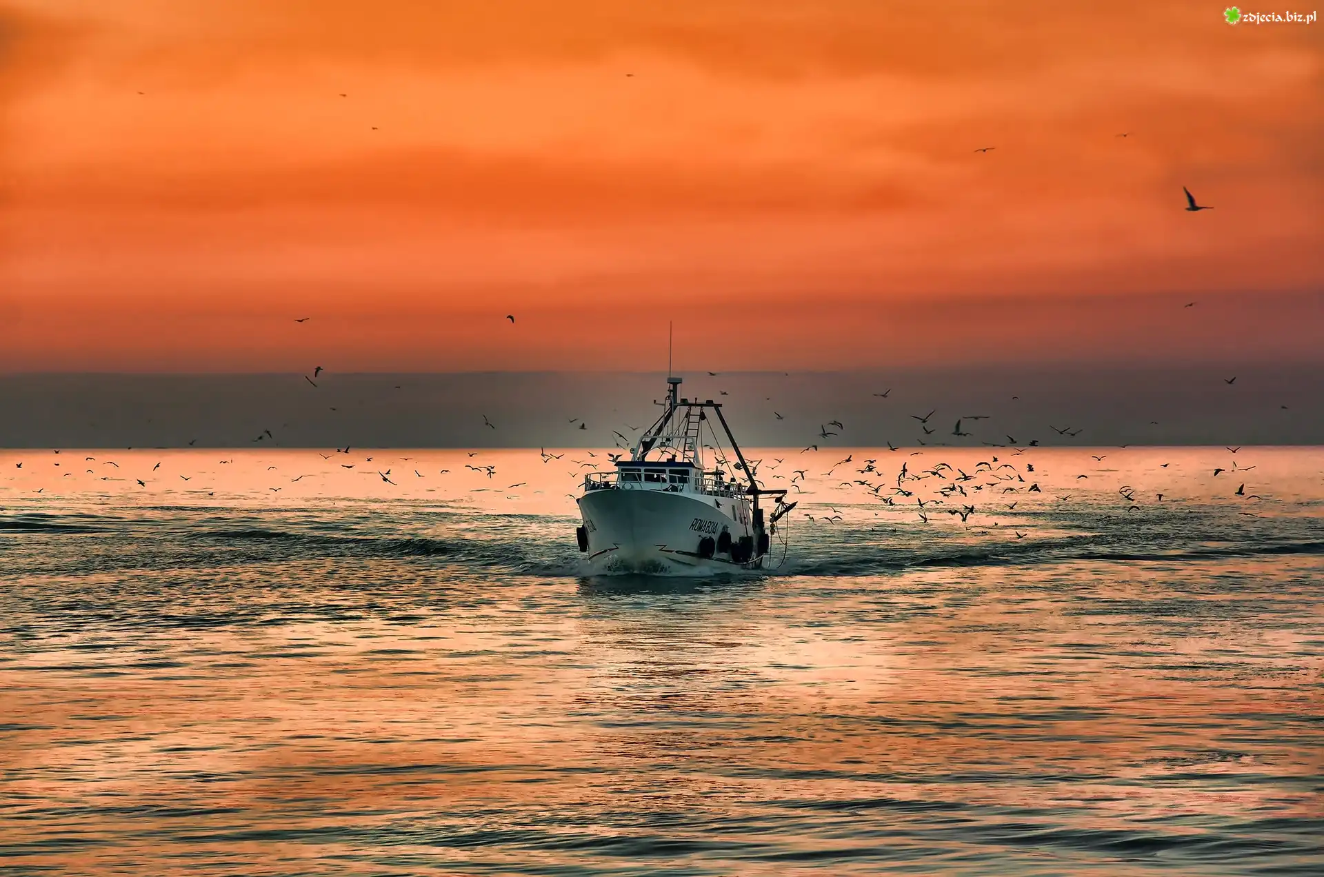 Zdjęcie, Morze, Zachód, Słońca, Statek, Ptaki