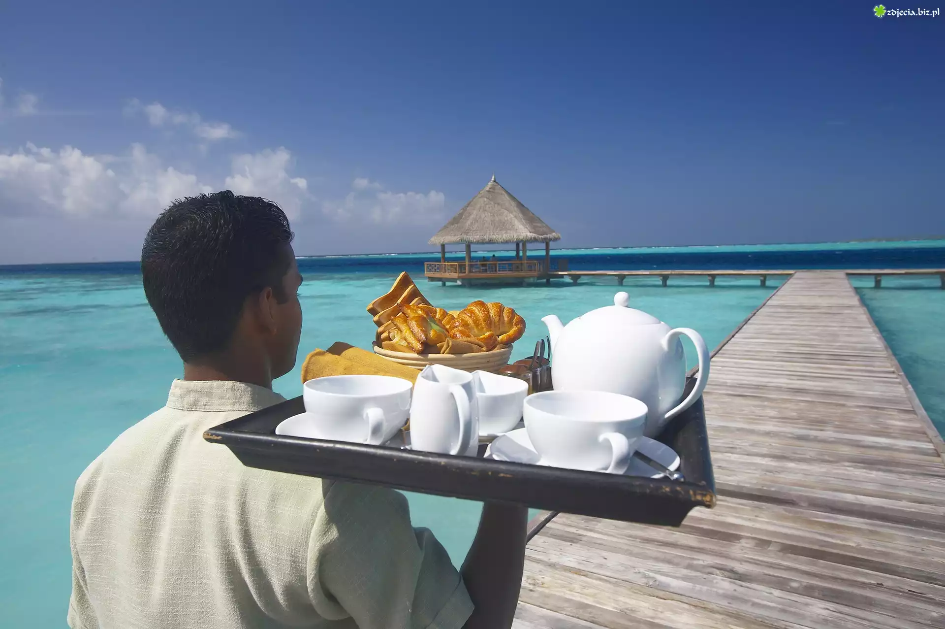 Zdjęcie Morze, Molo, Mężczyzna, Taca, Filiżanki