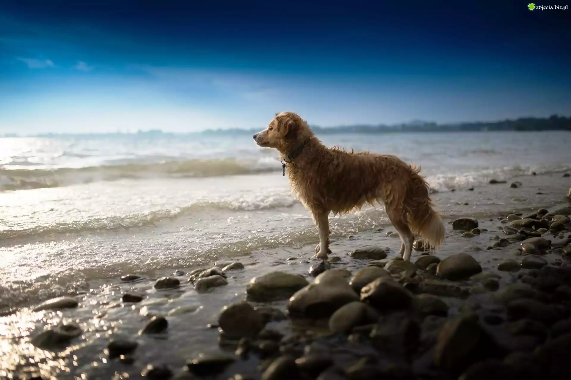 Zdjęcie Morze, Kamienie, Fale, Pies, Świt, Oczekiwanie