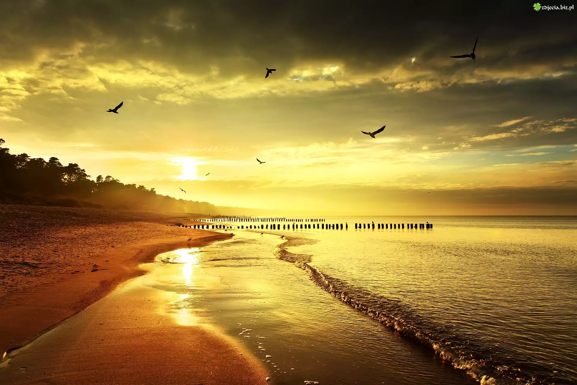 Zdjęcie Morze, Plaża, Ptaki, Wschód Słońca