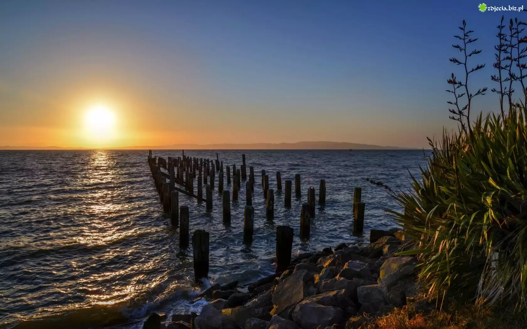 Zdjęcie Morze, Pale, Skały, Krzewy, Wschód, Słońca