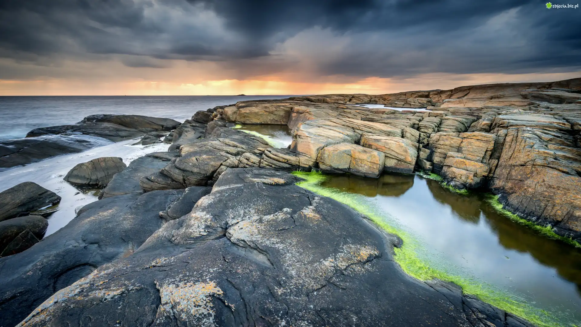 Zdjęcie Morze, Glony, Skały, Niebo, Wschód słońca