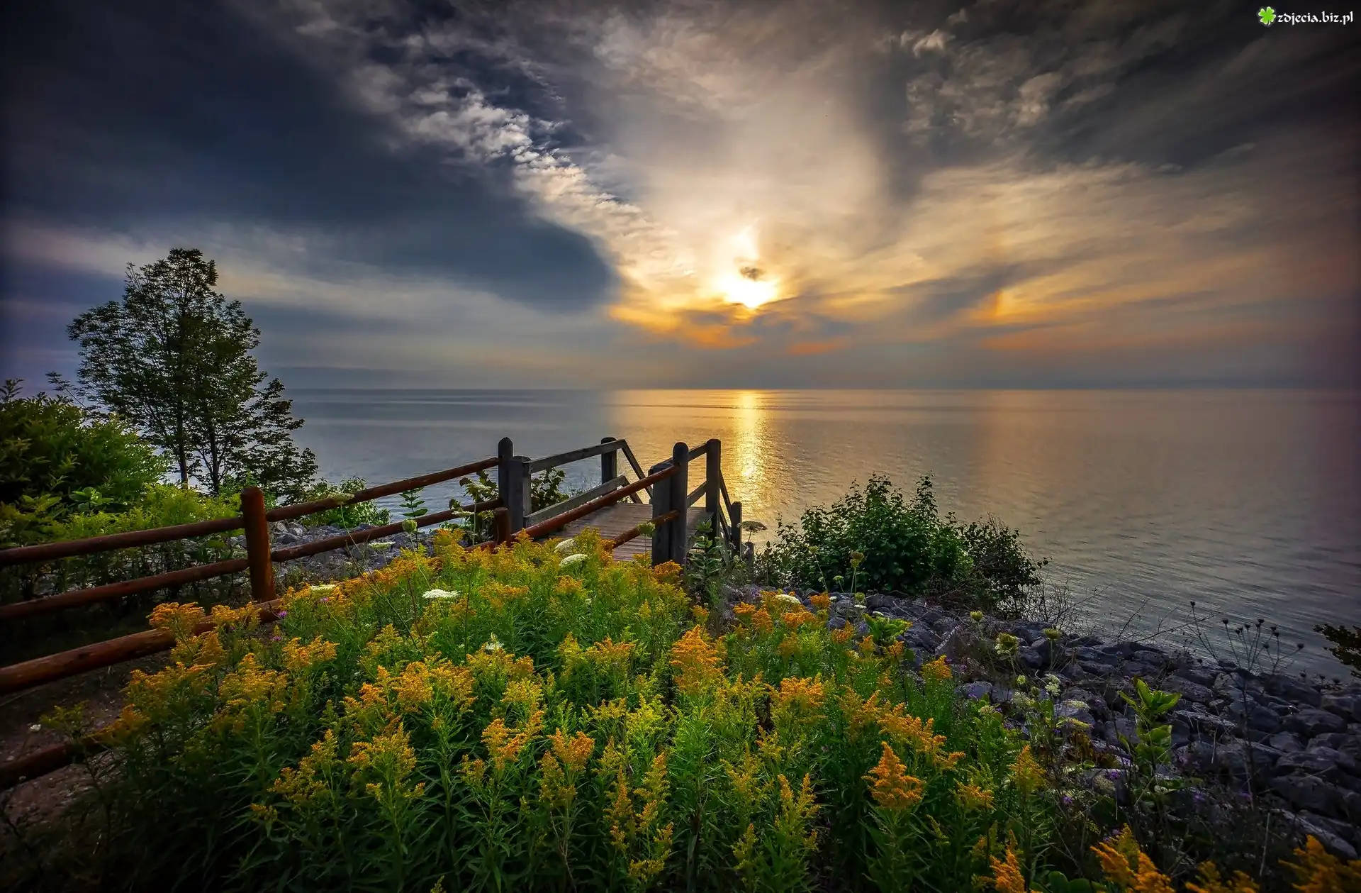 Zdjęcie Morze, Wybrzeże, Zejście, Kwiaty, Wschód Słńca