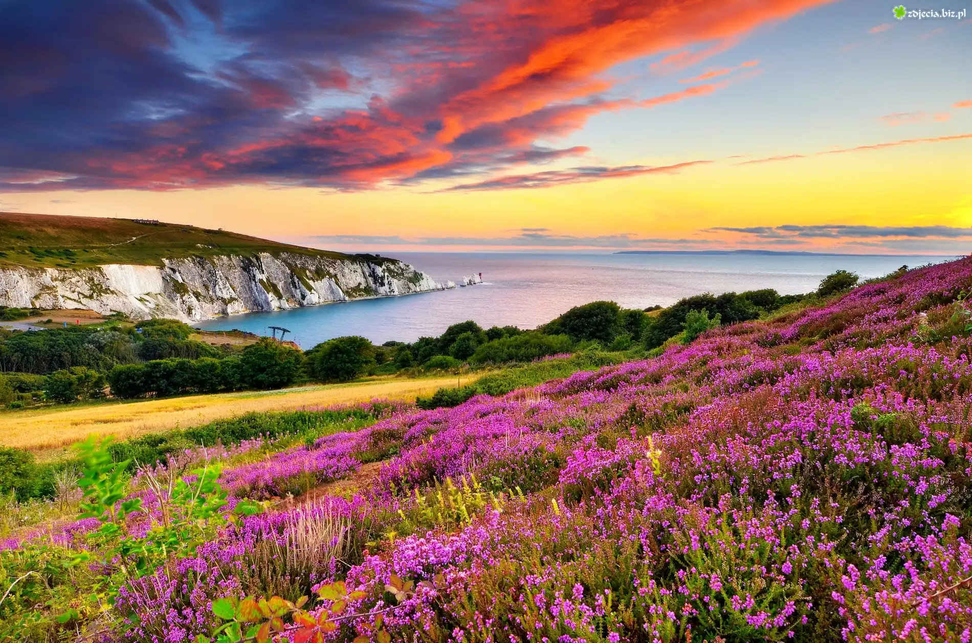 Zdjęcie Morze, Klif, Wzgórza, Wrzosowisko