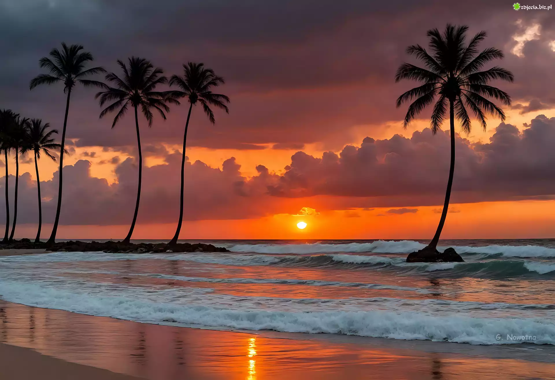 Zdjęcie Palmy, Morze, Zachód słońca, Chmury