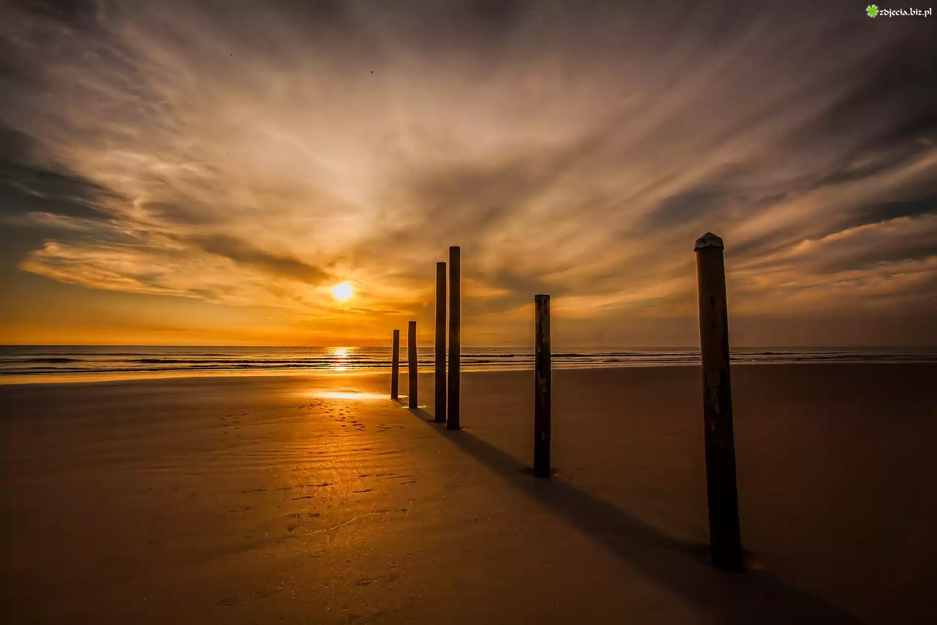 Zdjęcie Morze, Plaża, Drewniane, Pale, Zachód Słońca