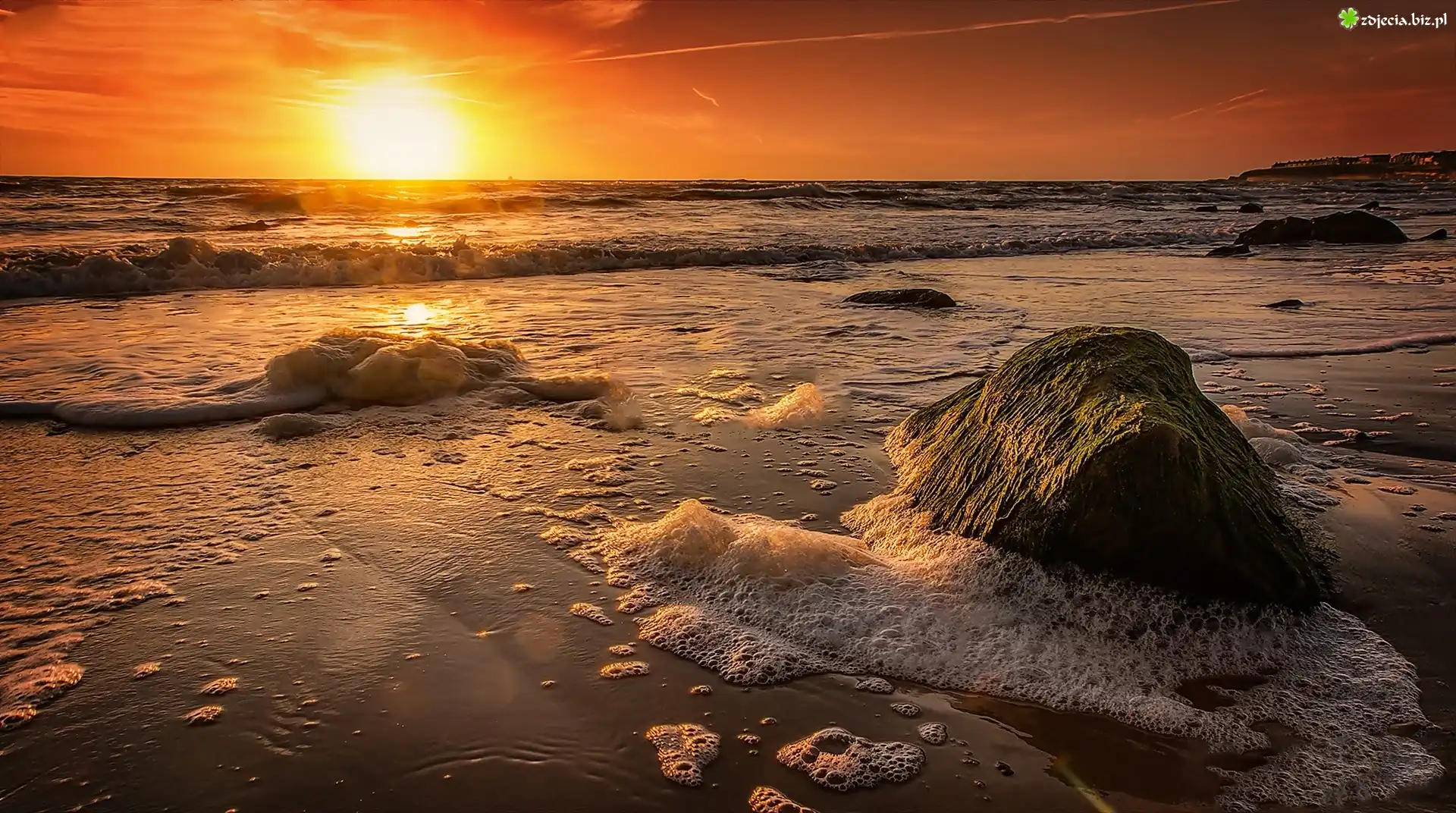 Zdjęcie Morze, Kamienie, Fale, Zachód, Słońca