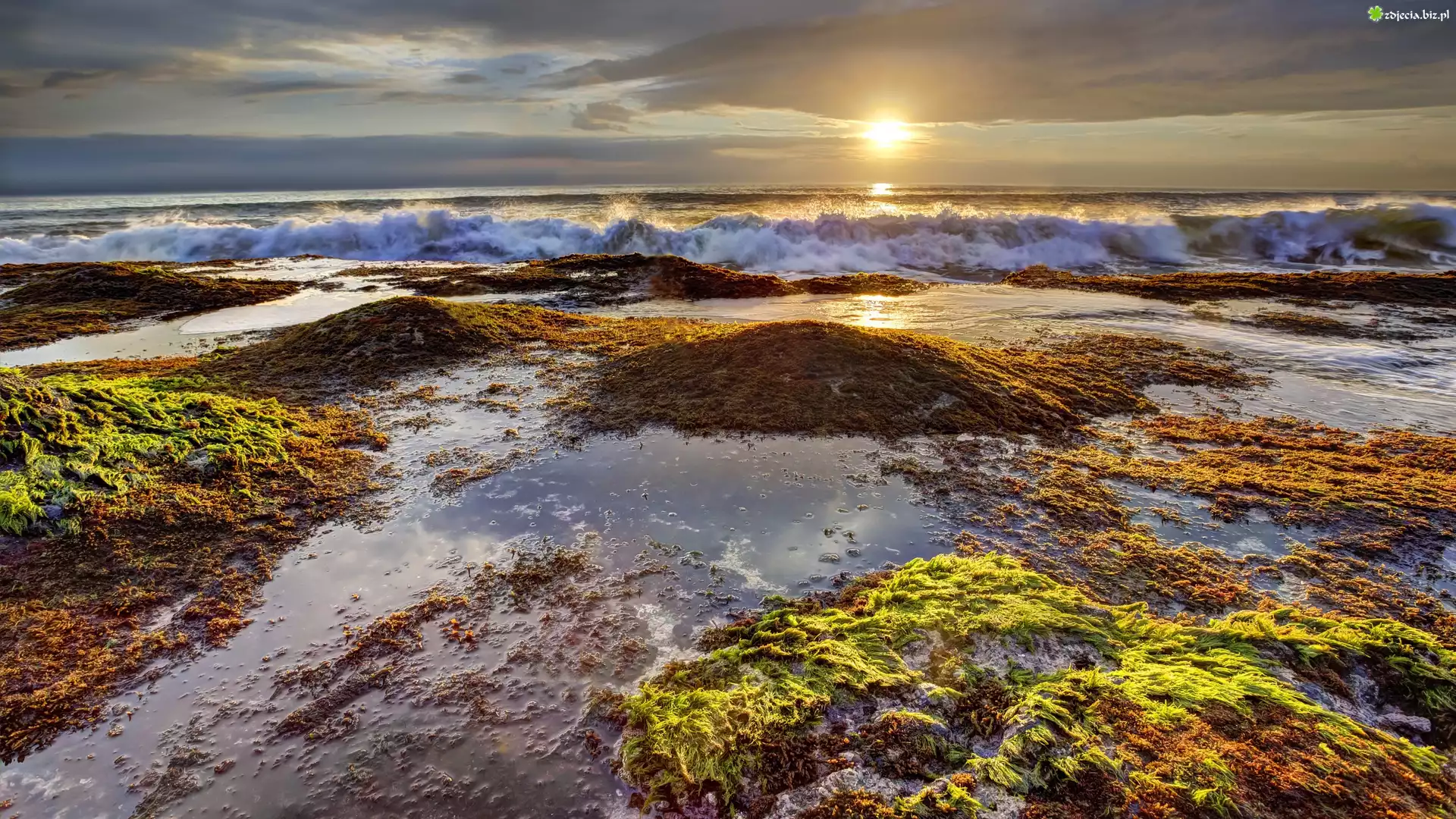 Zdjęcie Morze, Plaża, Fale, Wodorosty, Zachód Słońca
