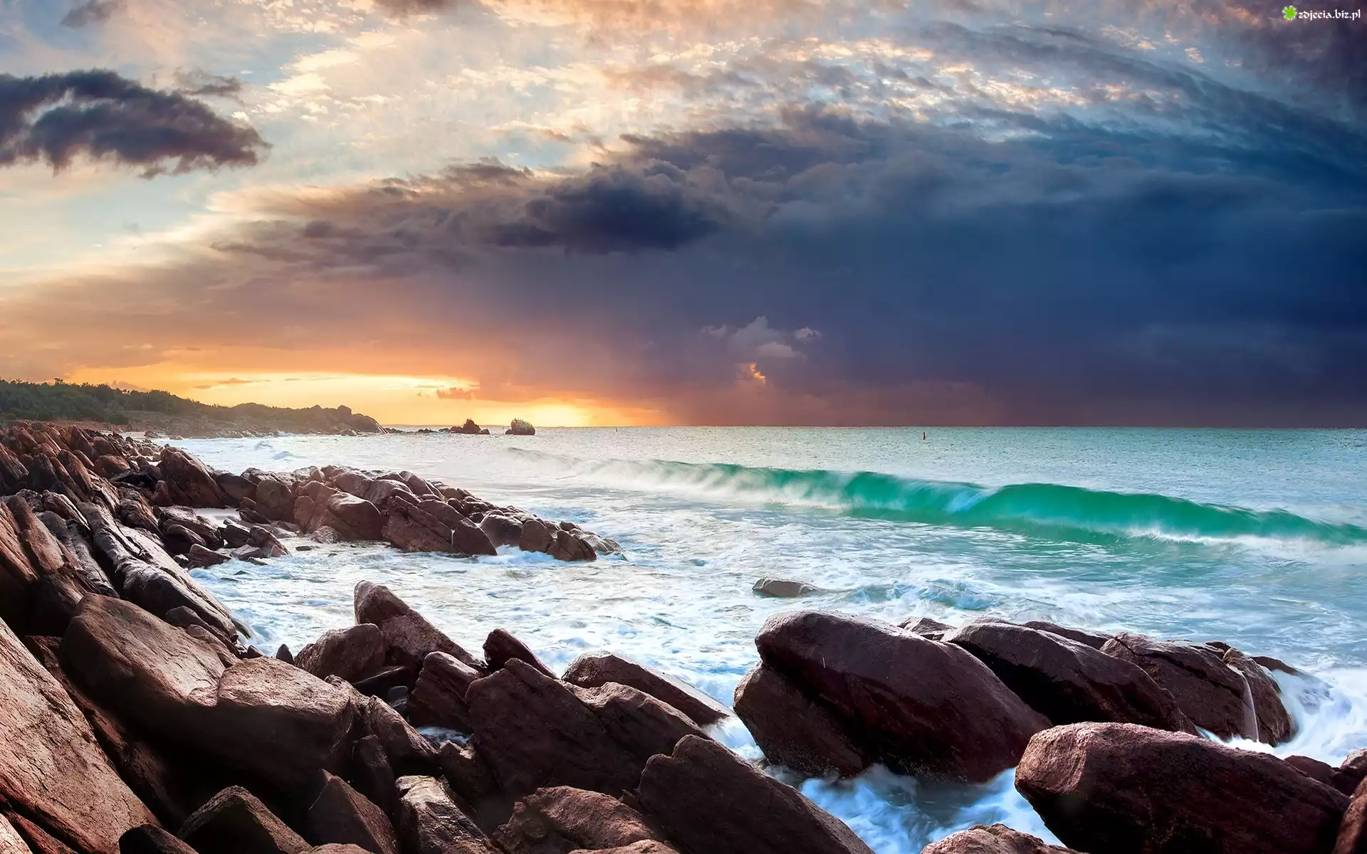 Zdjęcie Morze, Skały, Kamienie, Chmury, Zachód słońca