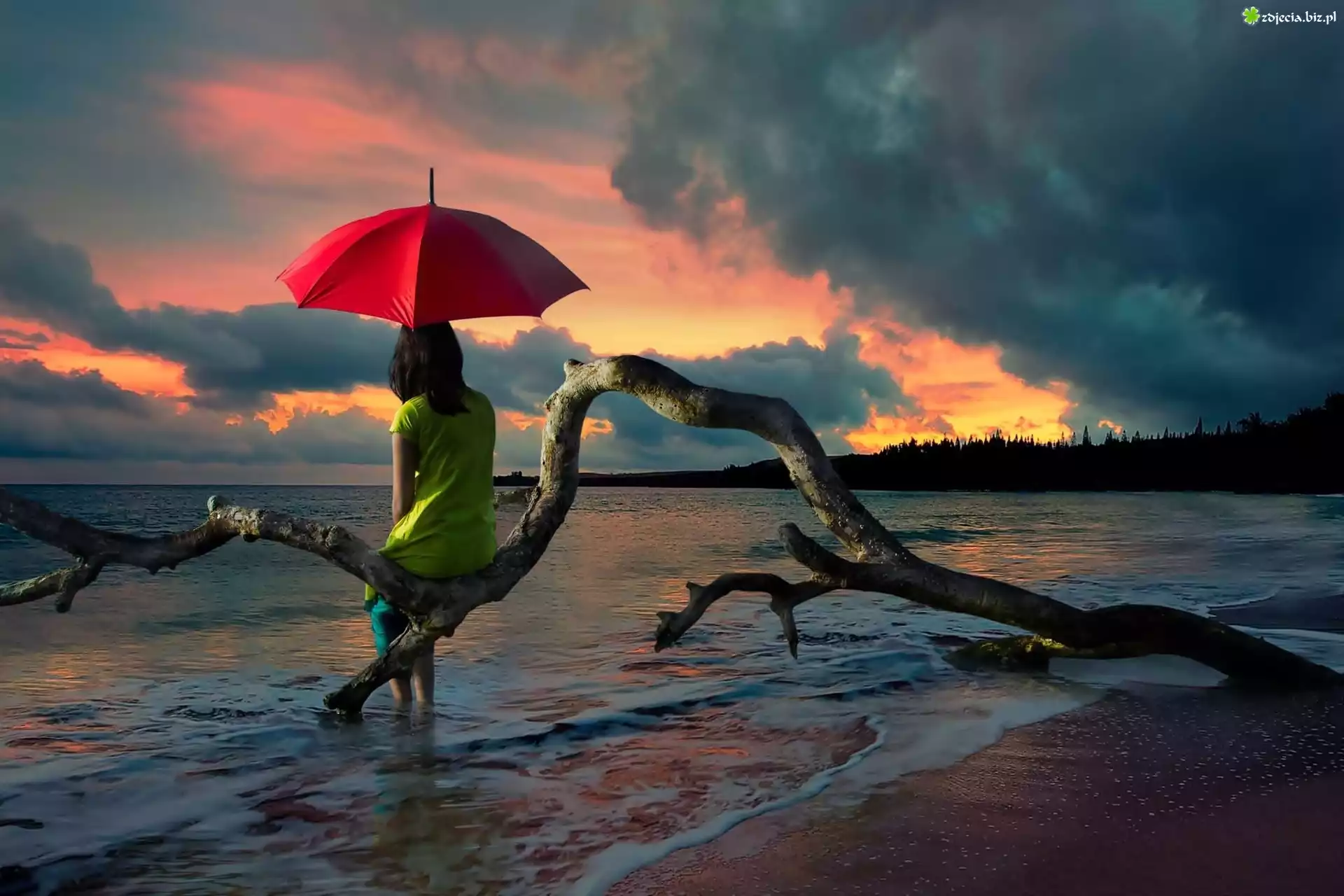 Zdjęcie Morze, Plaża, Kobieta, Parasolka, Zachód, Słońca