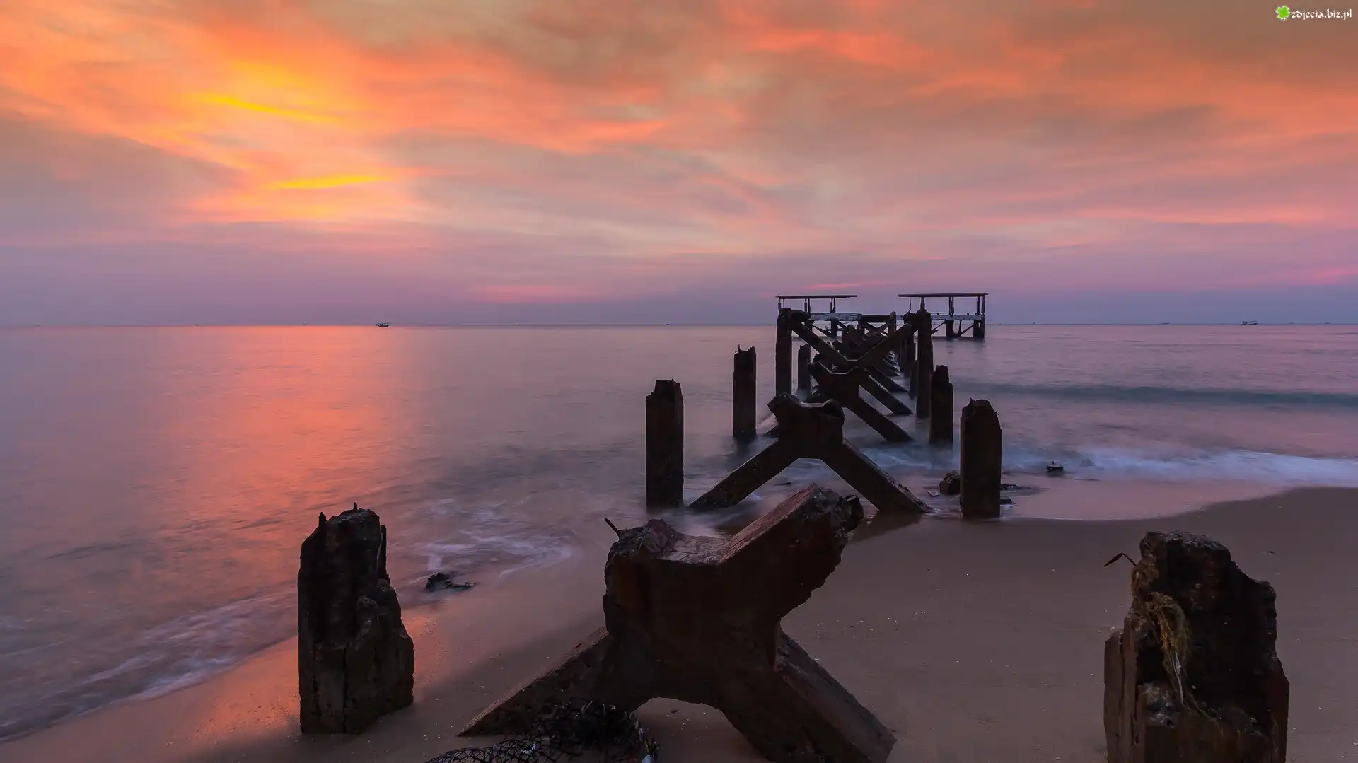 Zdjęcie Morze, Zniszczony, Pomost, Zachód słońca