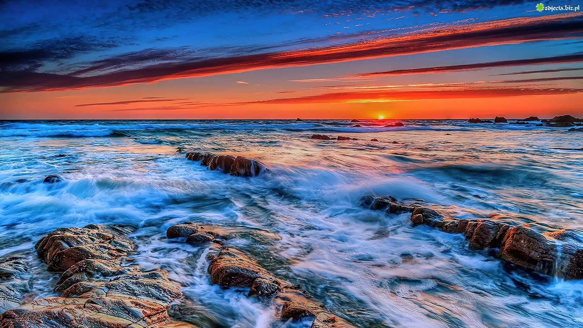 Zdjęcie Morze, Fale, Skały, Zachód, Słońca