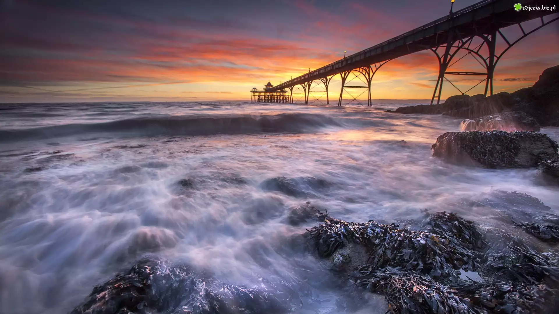 Zdjęcie Morze, Molo, Skały, Zachód słońca