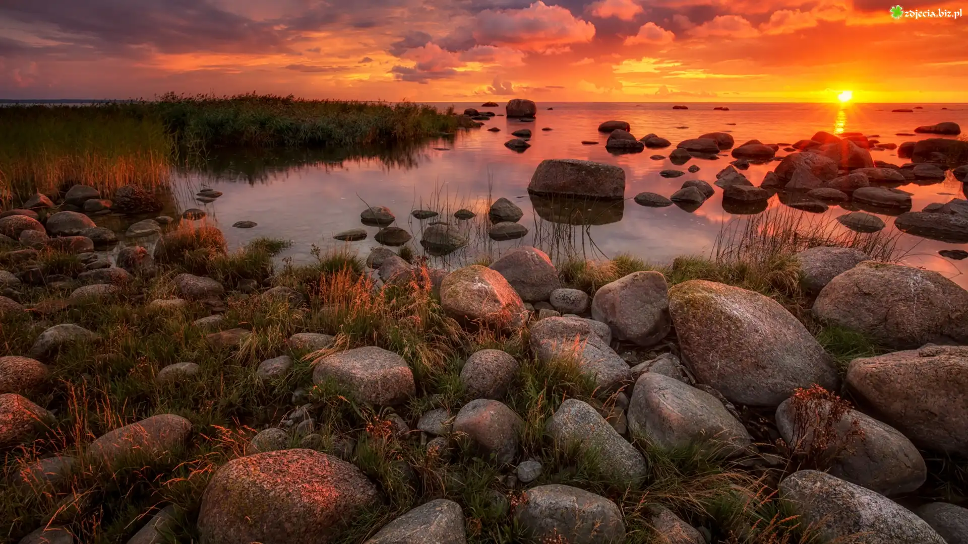 Zdjęcie Morze, Kamienie, Trawa, Zachód słońca