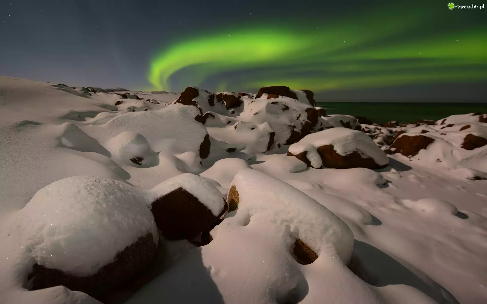 Zdjęcie Zorza polarna, Zima, Śnieg, Morze Barentsa, Ośnieżone, Kamienie, Teriberka, Zatoka Kolska, Obwód murmański, Rosja |