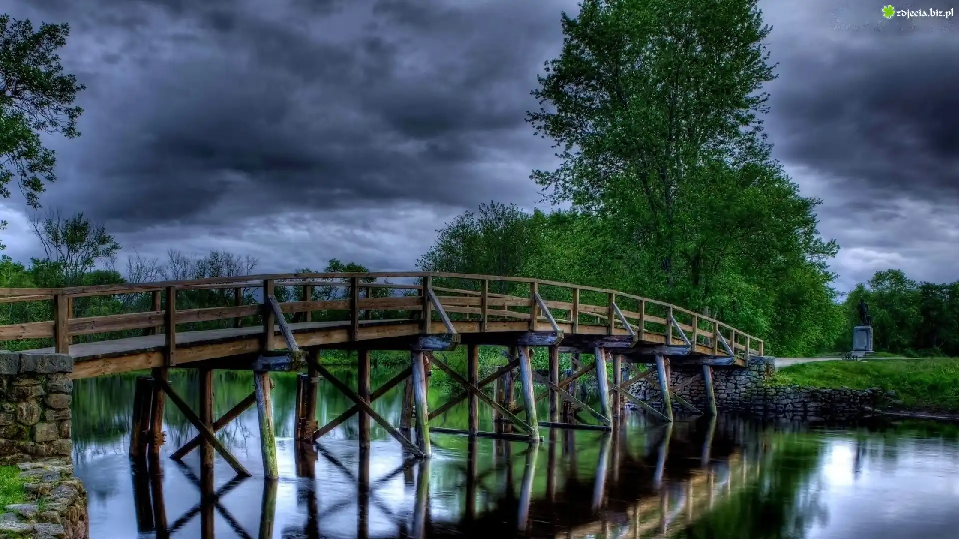 Zdjęcie Most, Drweniany, Rzeka, Drzewa, Chmury, Odbicie