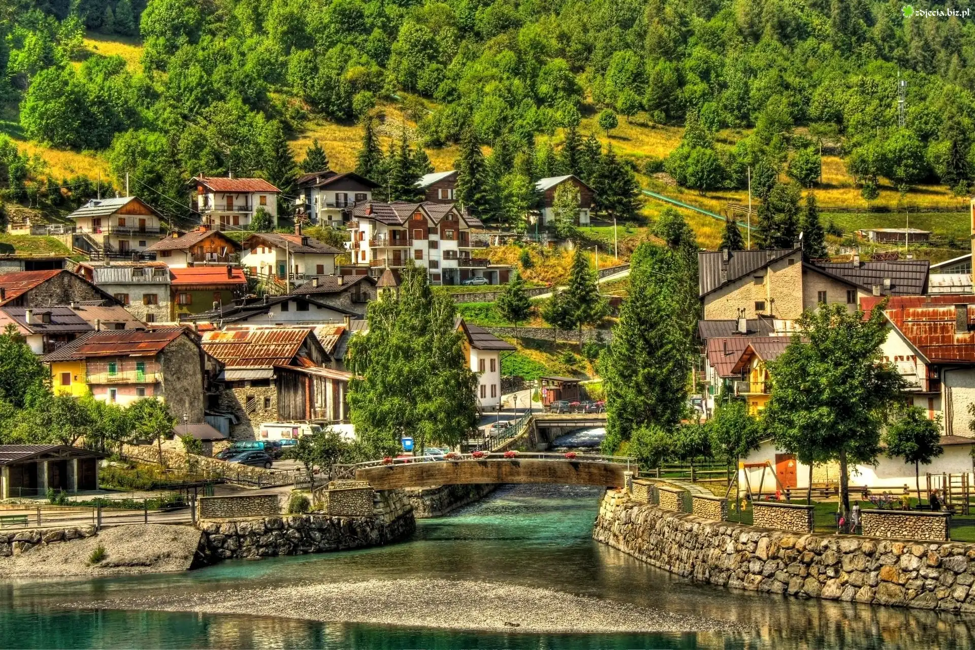 Zdjęcie Most, Brzegi, Rzeki, Pagórki, Domy
