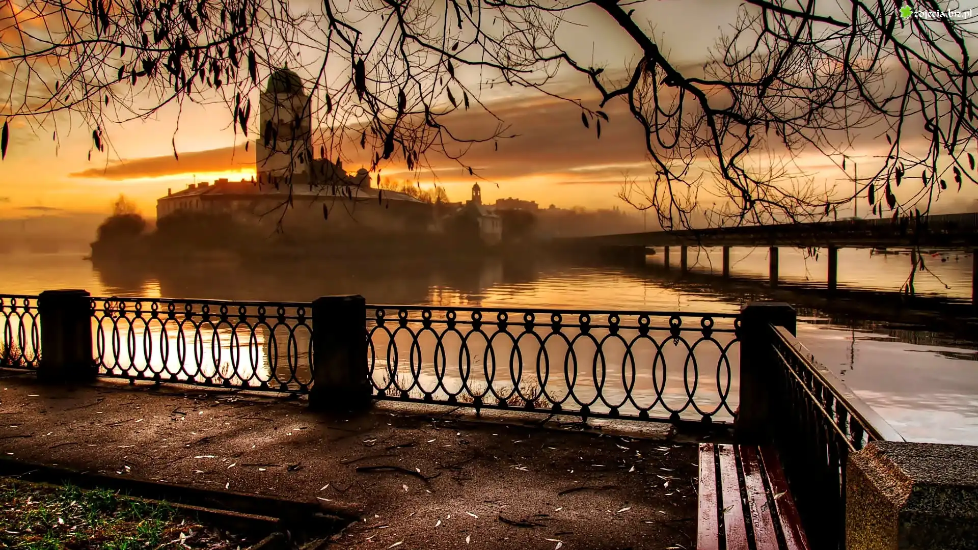 Zdjęcie, Rzeka, Most, Mgła, Zachód, Słońca, Zamek, Balustrada