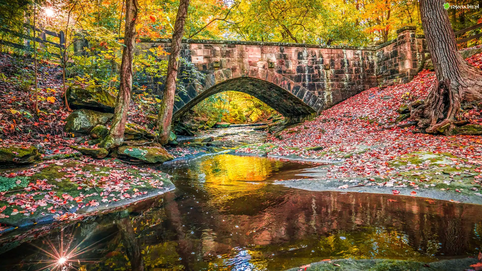 Zdjęcie Rzeka, Most, Drzewa, Jesień, Liście, Promienie słońca