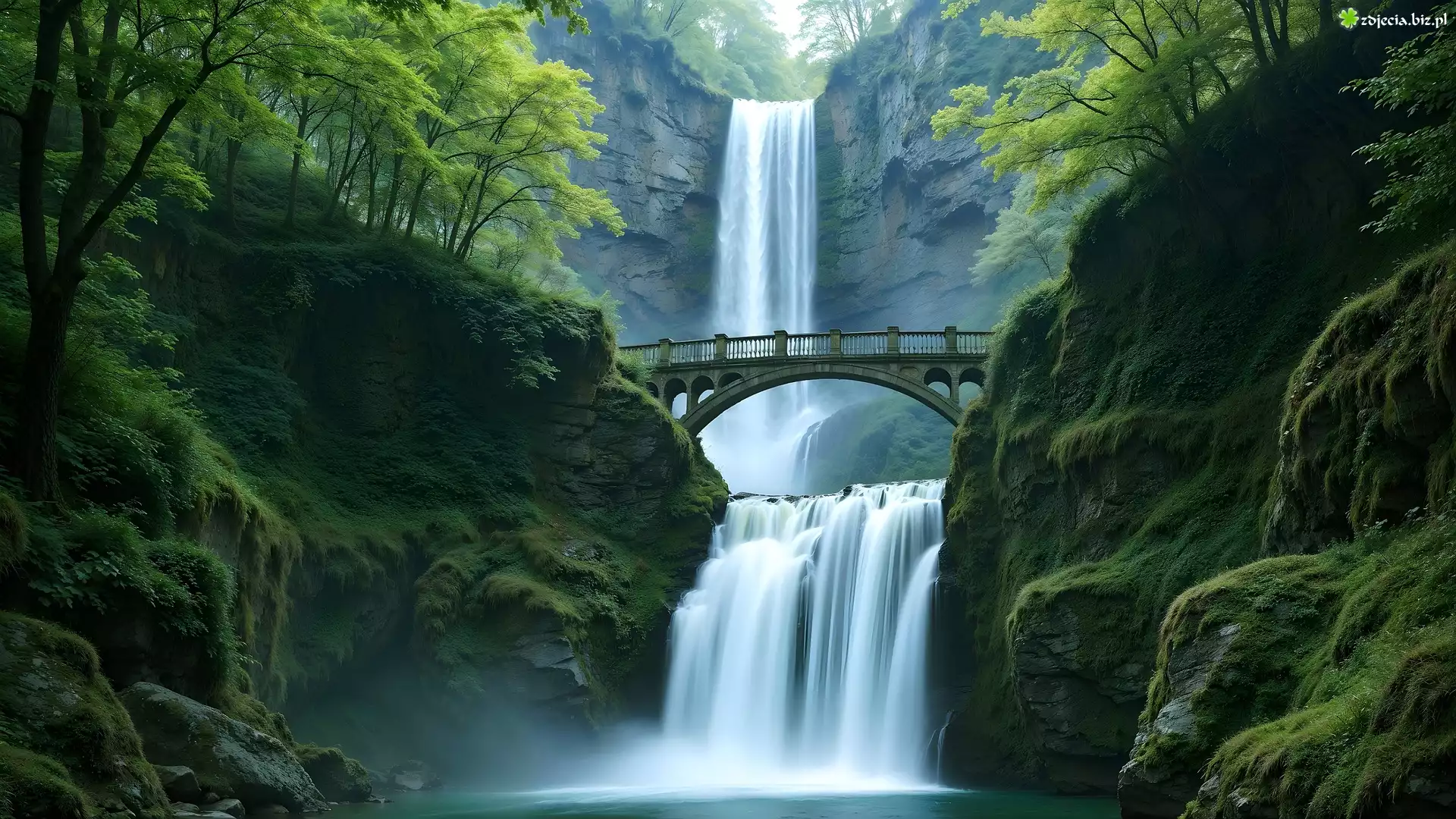 Zdjęcie Wodospad, Most, Skały, Drzewa, AI