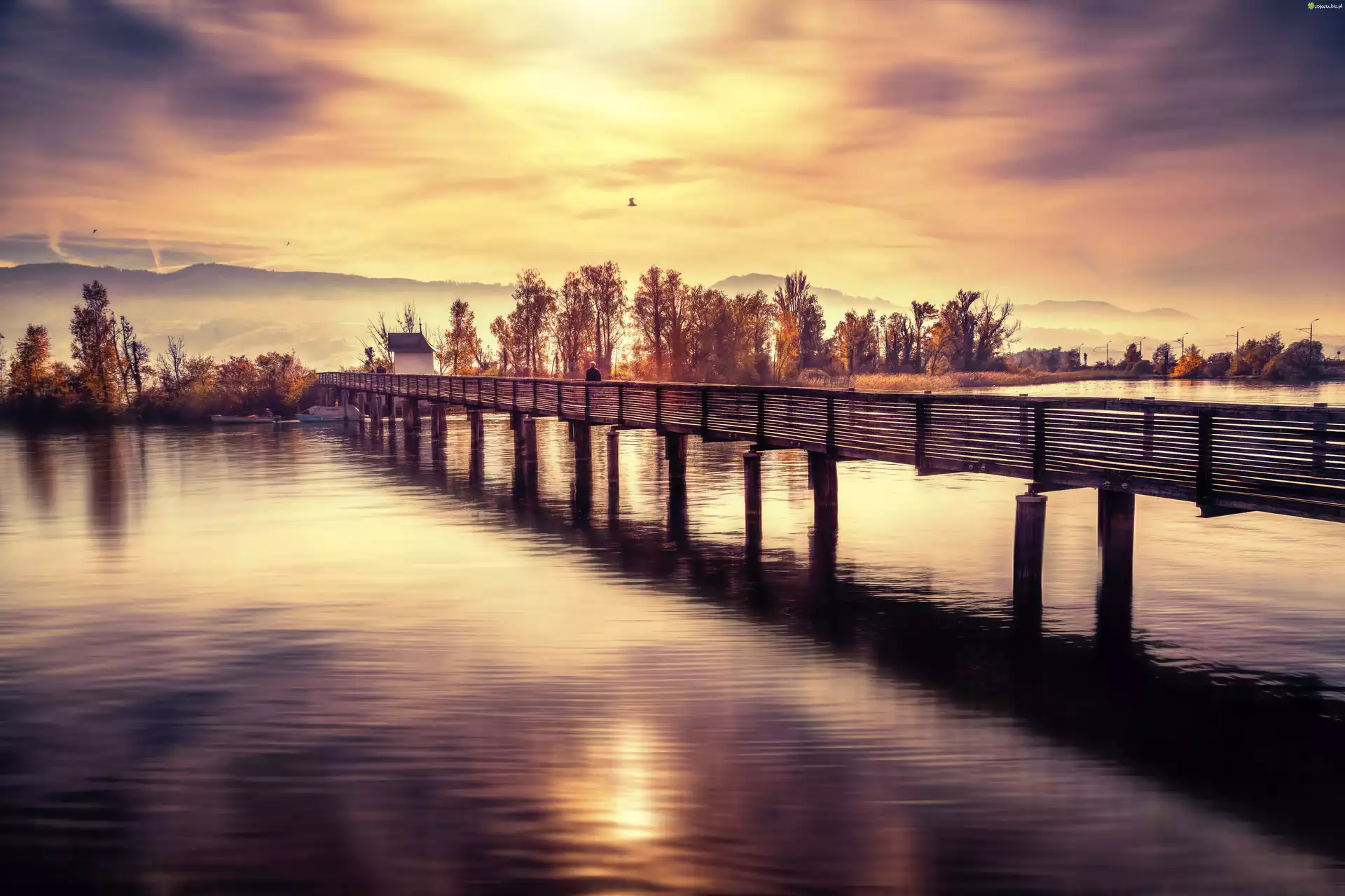 Zdjęcie, Most, Rzeka, Jesień, Mgła, Wschód, Słońca