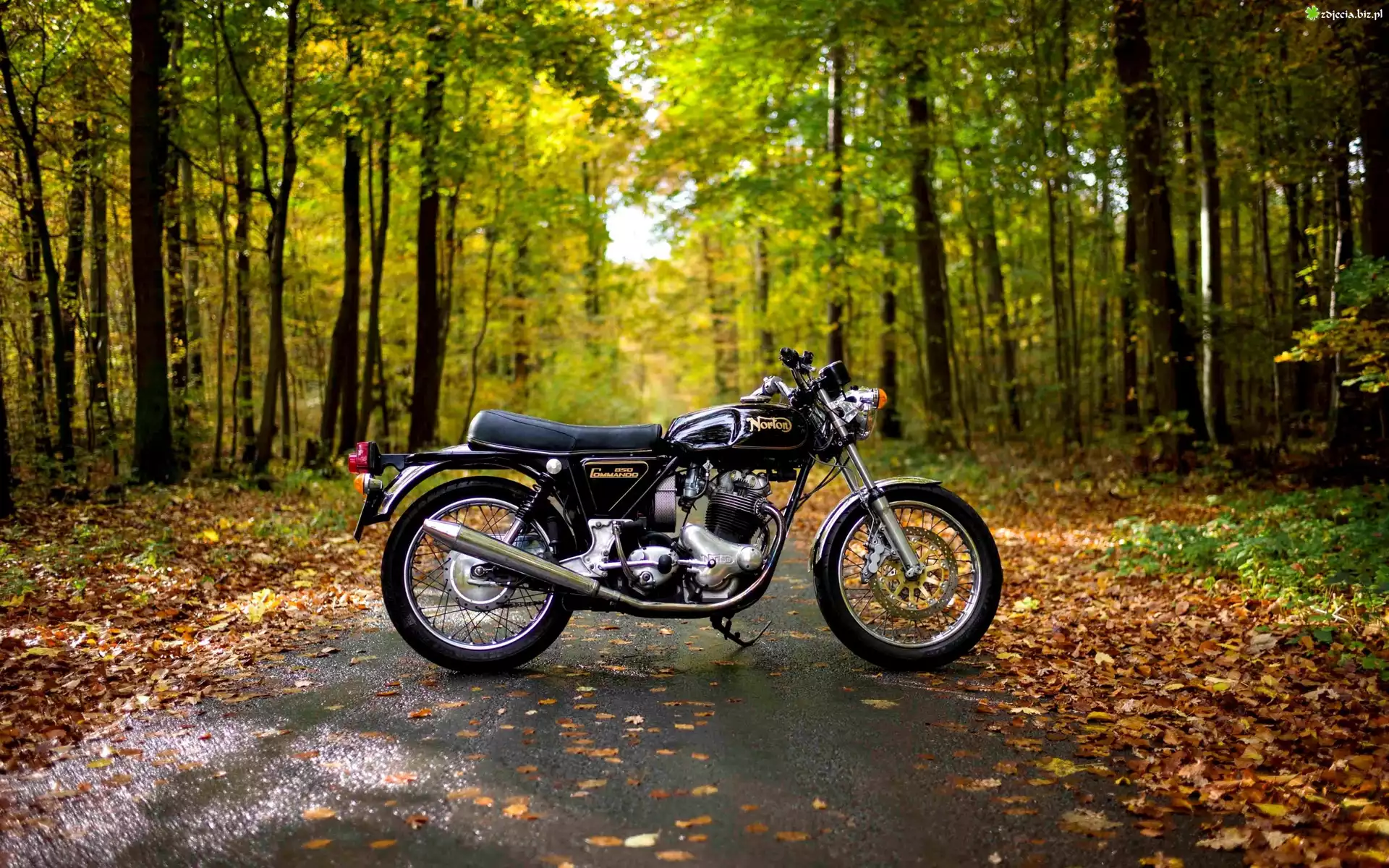 Zdjęcie Motocykl, Las, Droga, Liście, Jesień