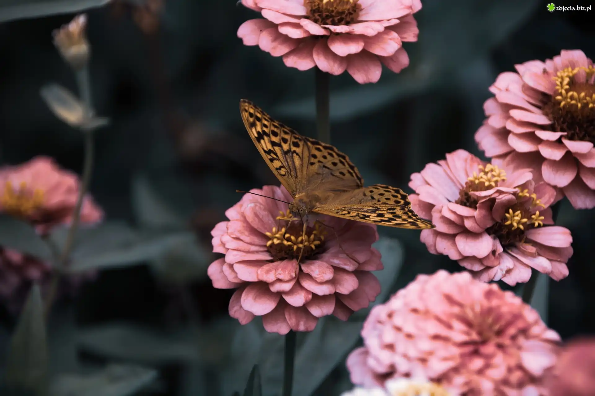 Zdjęcie, Motyl, Dostojka malinowiec, Różowe, Kwiaty, Cynie