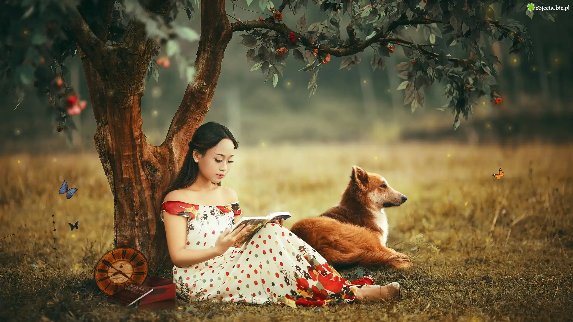 Zdjęcie Dziewczyna, Pies, Las, Motyle