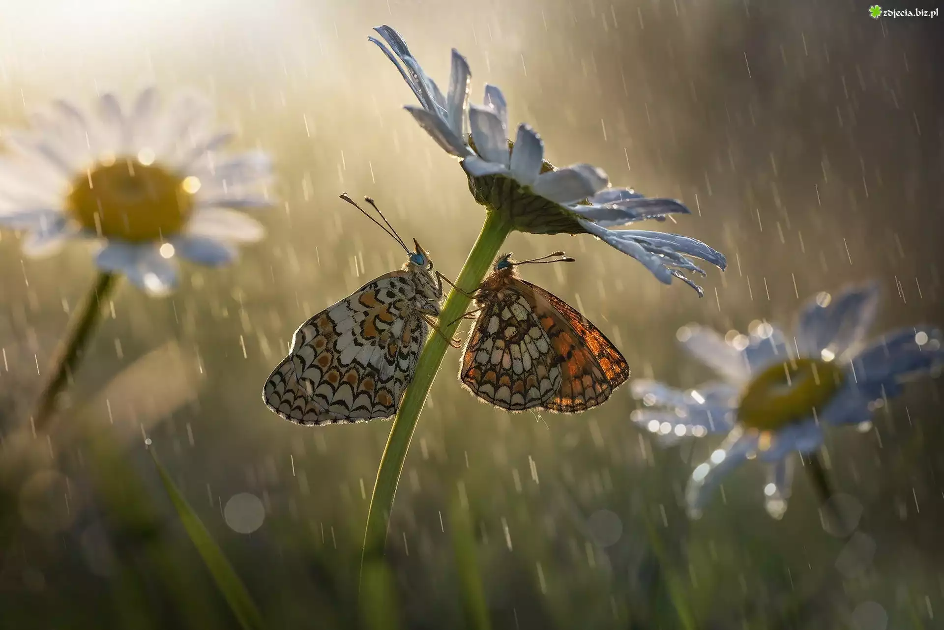 Zdjęcie Motyle, Przeplatki, Margerytki, Deszcz