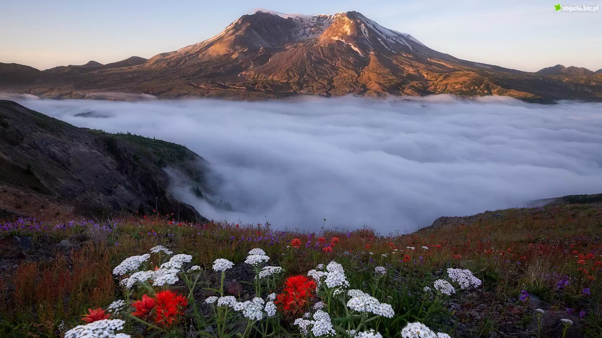 Zdjęcie Góra, Wulkan, Mount St Helens, Kwiaty, Mgła, Stan Waszyngton, Stany Zjednoczone