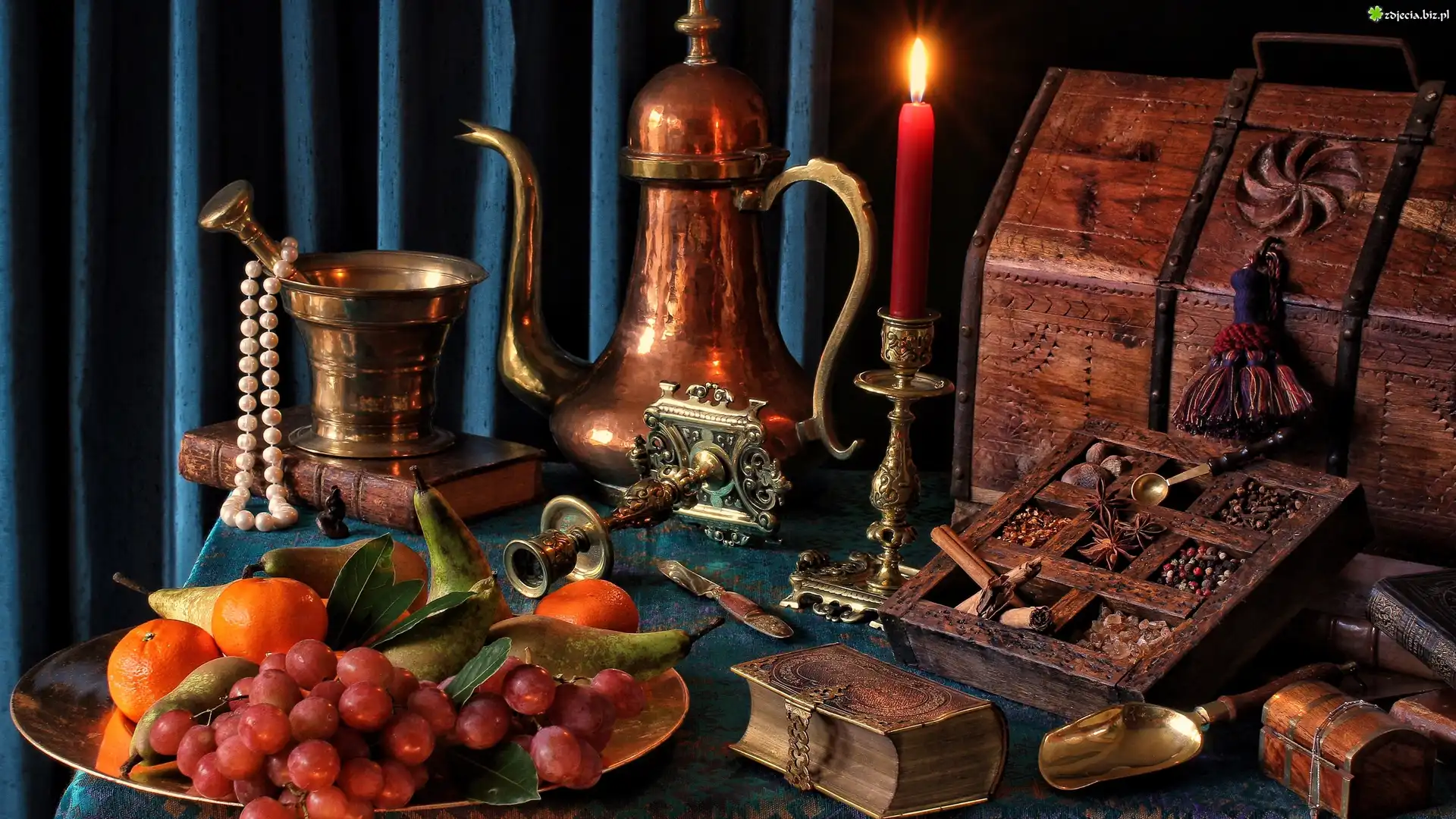 Zdjęcie Kompozycja, Owoce, Moździerz, Perły, Dzbanek, Świeca, Szkatułka, Skrzynka, Książki, Świecznik, Przyprawy |