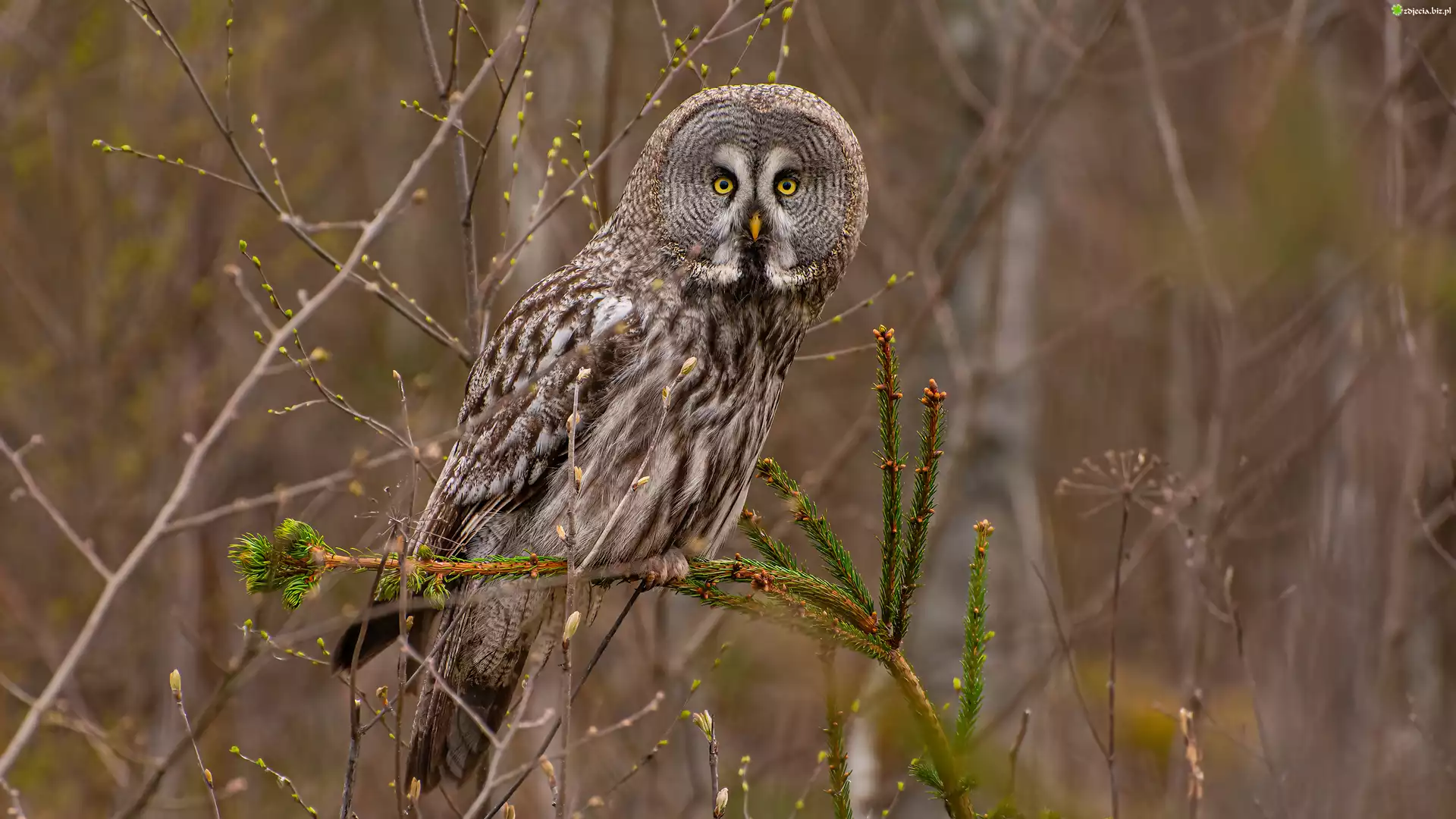 Zdjęcie Puszczyk mszarny, Gałązka, Sowa, Ptak