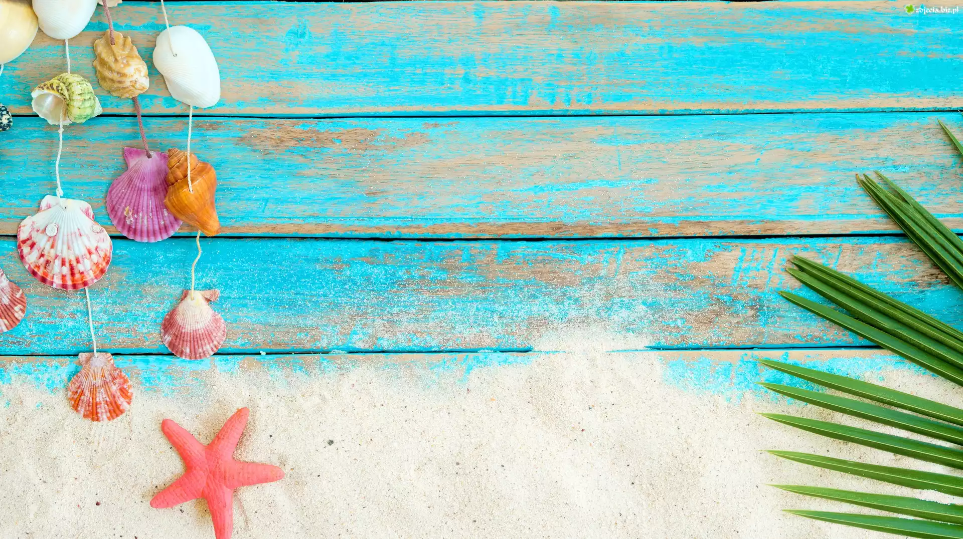 Zdjęcie Muszelki, Sznurki, Rozgwiazda, Piasek, Deski
