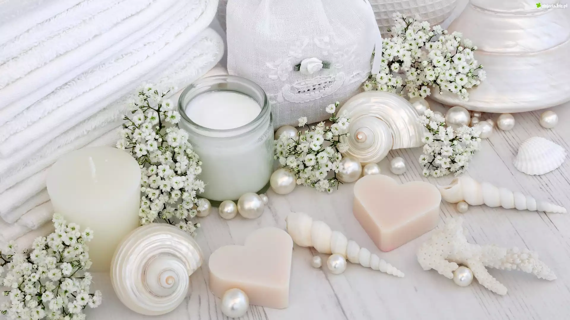 Zdjęcie SPA, Muszle, Świece, Mydełka, Kwiatki, Perły, Ręczniki, Deski