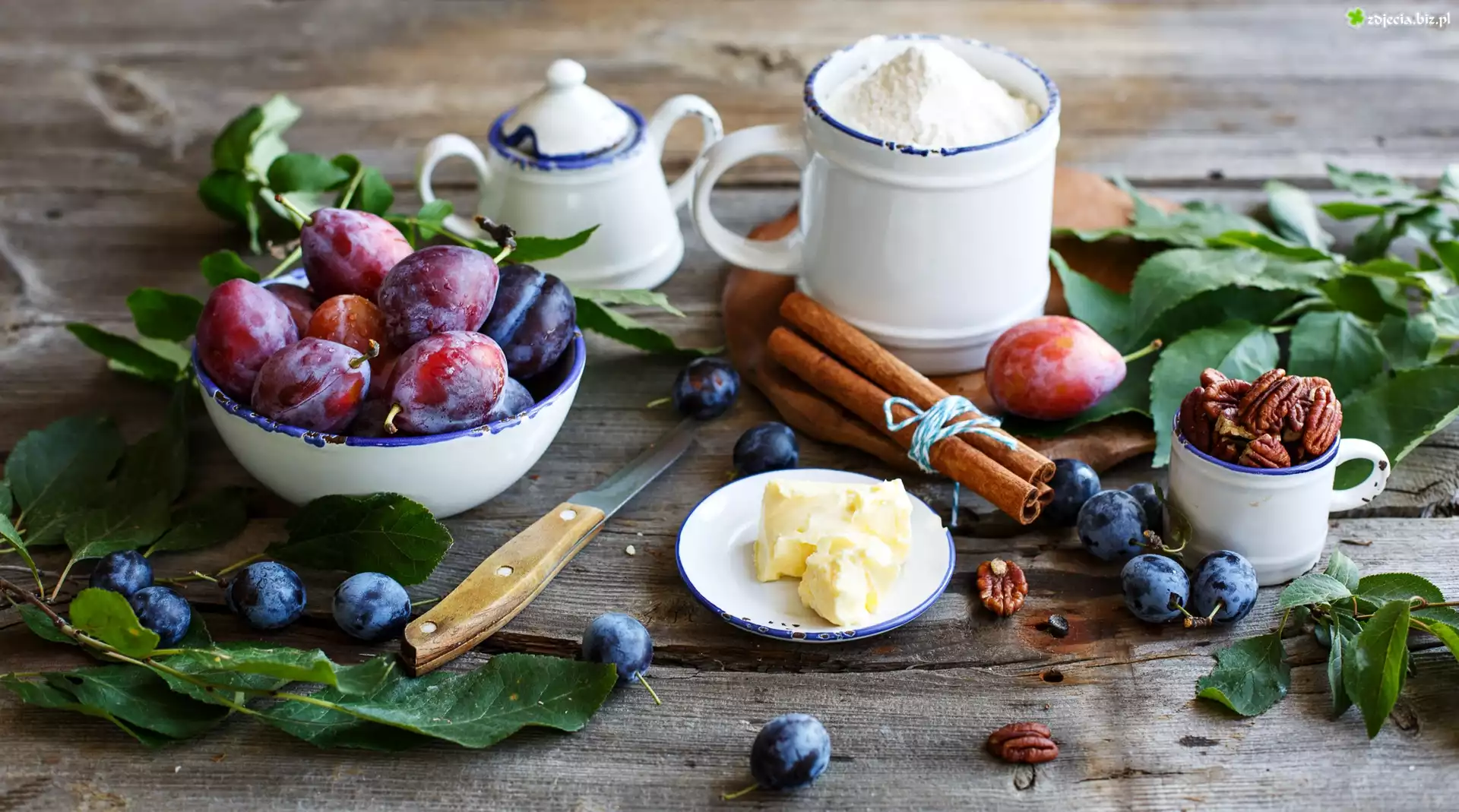 Zdjęcie Śliwki, Orzechy, Naczynia, Listki