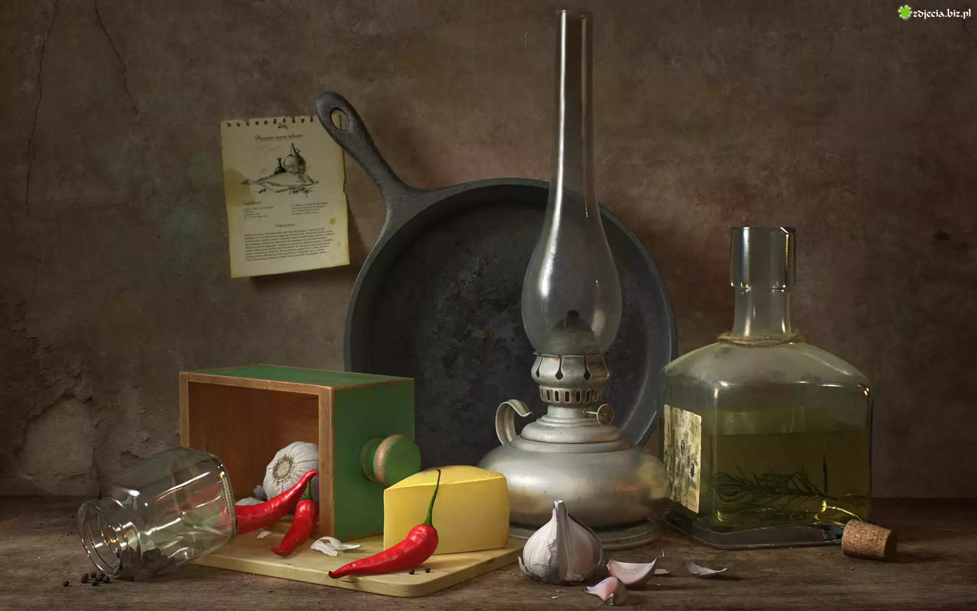 Zdjęcie Kompozycja, Lampa naftowa, Butelka, Warzywa