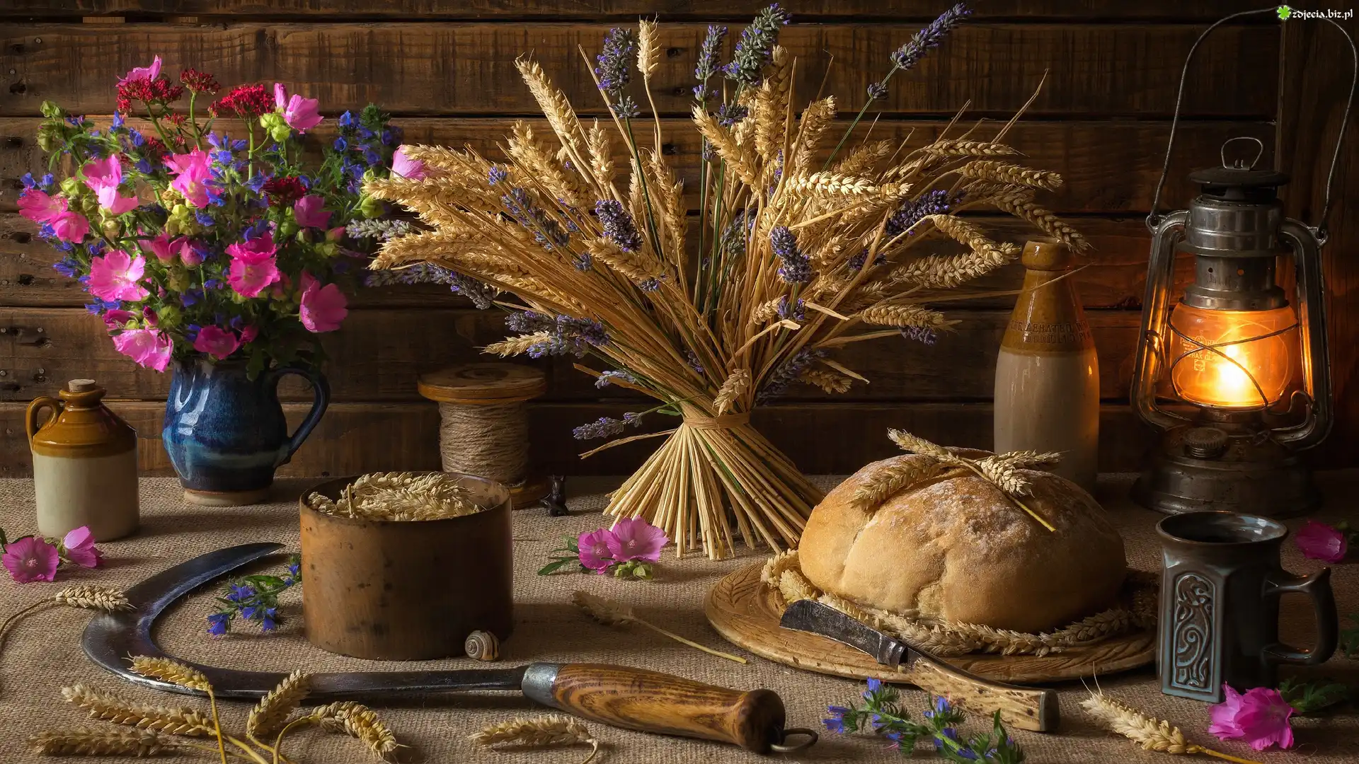 Zdjęcie Kompozycja, Kwiaty, Zboże, Bukiet, Chleb, Sierp, Naczynia, Lampa naftowa